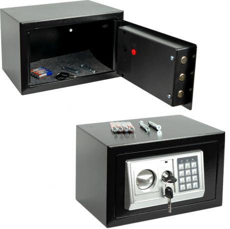 Металевий сейф з електронним кодовим замком та ключем (розмір 20×31×20 см) — компактне й надійне рішення для зберігання грошей, документів, коштовностей і цінних речей вдома, в офісі або в готелі. Оснащений цифровою панеллю з можливістю введення PIN-коду та механічним замком із двома ключами на випадок екстреного відкриття. Усередині — м’яке покриття для захисту вмісту. У комплекті: 2 ключі, 2 кронштейни з болтами, 4 батарейки, захисні куточки для транспортування та інструкція англійською мовою.