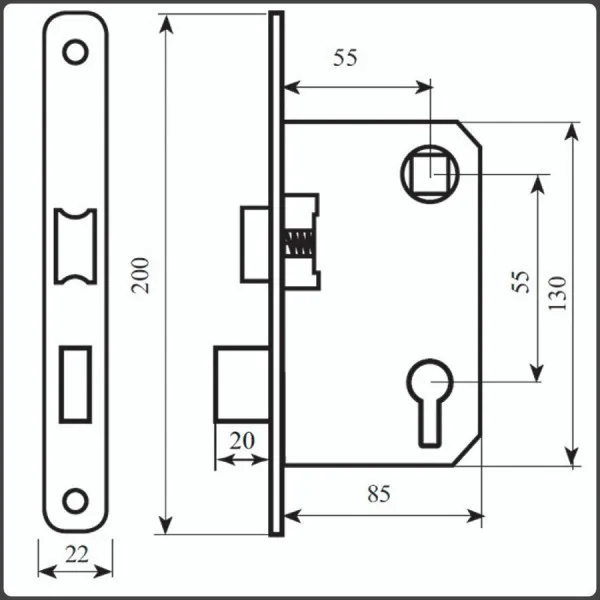 - віддалена відстань до ключового отвору (backset) - 55 мм;