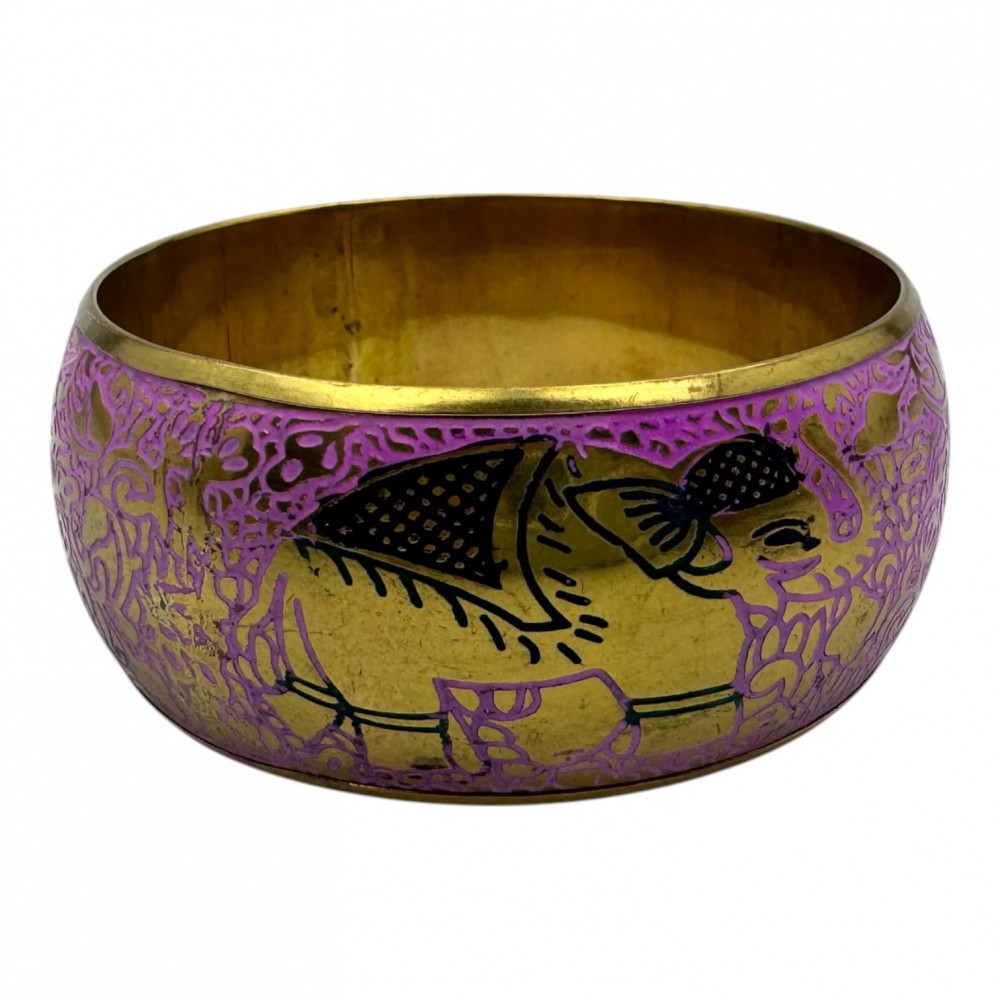 Оригинальный бронзовый браслет с яркой эмалью и гравировкой в восточном стиле. Украшен изображением слонов — символов силы, мудрости и благополучия. Благодаря насыщенным цветам и этническому дизайну, браслет станет выразительным акцентом вашего образа и привлечёт внимание к деталям.