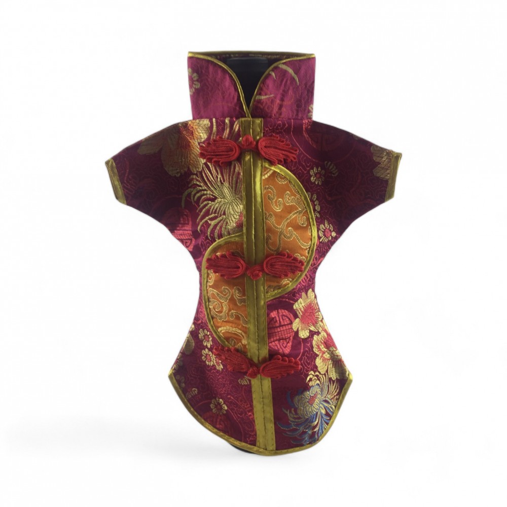 Этот элегантный чехол на бутылку выполнен в традиционном восточном стиле и напоминает миниатюрное кимоно. Он изготовлен из прочной ткани с ярким орнаментом, включающим символы и изображения, типичные для восточной культуры.
