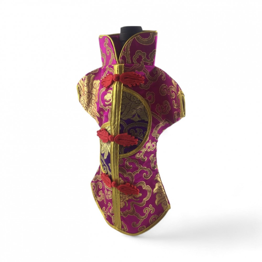 Этот элегантный чехол на бутылку выполнен в традиционном восточном стиле и напоминает миниатюрное кимоно. Он изготовлен из прочной ткани с ярким орнаментом, включающим символы и изображения, типичные для восточной культуры.