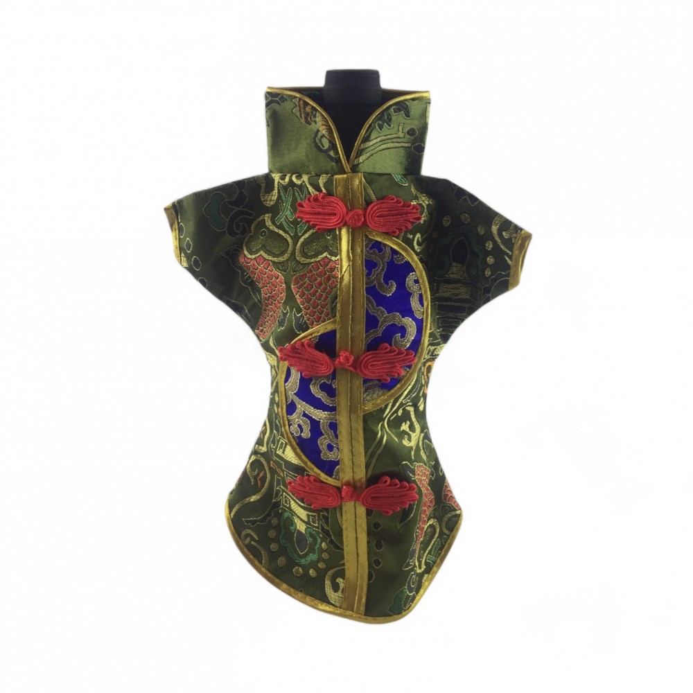 Этот элегантный чехол на бутылку выполнен в традиционном восточном стиле и напоминает миниатюрное кимоно. Он изготовлен из прочной ткани с ярким орнаментом, включающим символы и изображения, типичные для восточной культуры.
