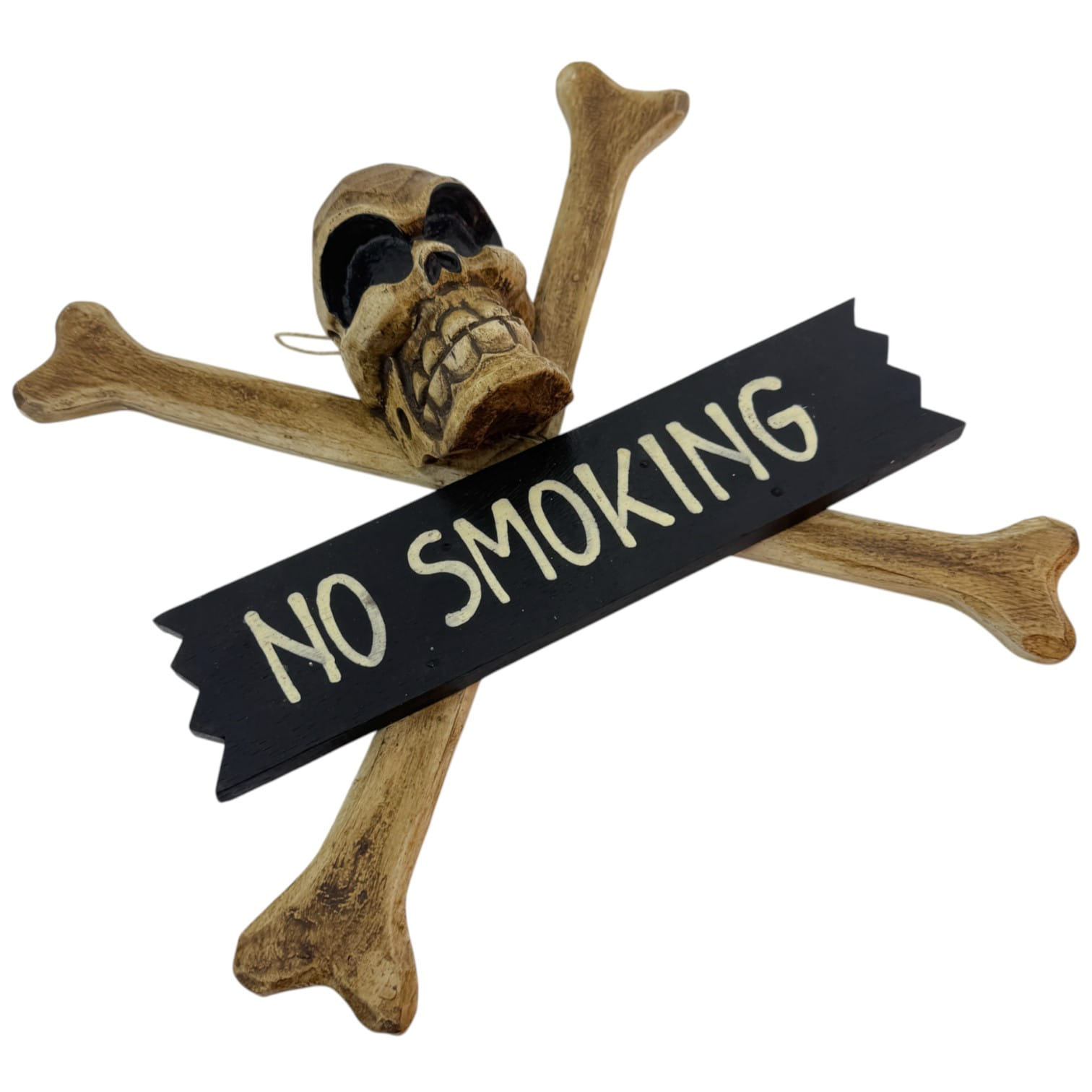 Оригинальное интерьерное украшение в виде черепа с перекрещенными костями и надписью "NO SMOKING". Такая табличка привлечёт внимание и добавит характер в любое пространство — от дома до тематического кафе, студии или бара.
