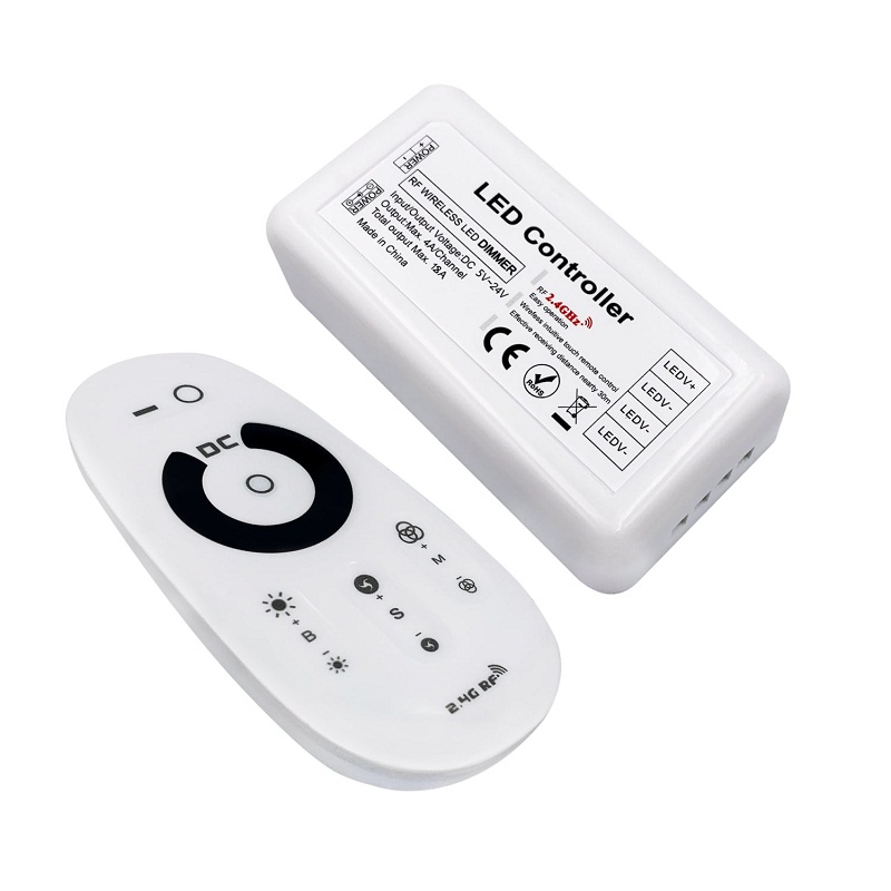 Пульт ДУ оснащен сенсорными клавишами и работает на батарейках 2*AAA с рабочим напряжением 3V DC. Димер поддерживает рабочую частоту 2.4-2.48 ГГц, что обеспечивает надежную передачу сигнала. Он способен работать в диапазоне температур от -20 до 55 °C, что делает его идеальным для использования в разных температурных условиях.