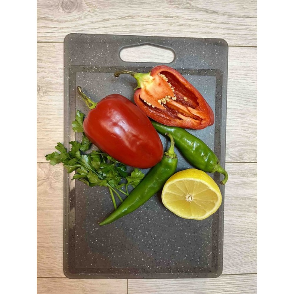 Універсальна обробна дошка виготовлена із харчового пластику. Не вбирає вологу, запахи, стійка до сколів, тріщин, порізів та розшарування. Особлива дизайнерська текстура оброблена для більш тривалого використання та безпечна для лез ножів.