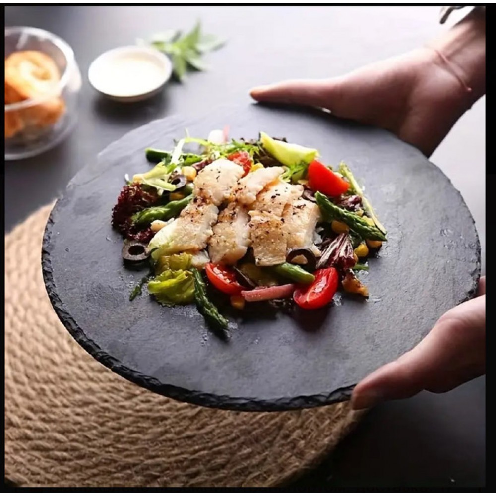 Сланцевий посуд виготовлений з натурального каменю. Посуд ідеально підходить для подачі суші, ролів, фруктів, сирів, горіхів та інших видів закусок. Вона не піддається впливу миючих засобів і має високу міцність та довговічність. Краї посуду оформлені так, щоб було показано природну структуру справжнього каменю. Сланцевий посуд не підходить для миття у посудомийних машинах.