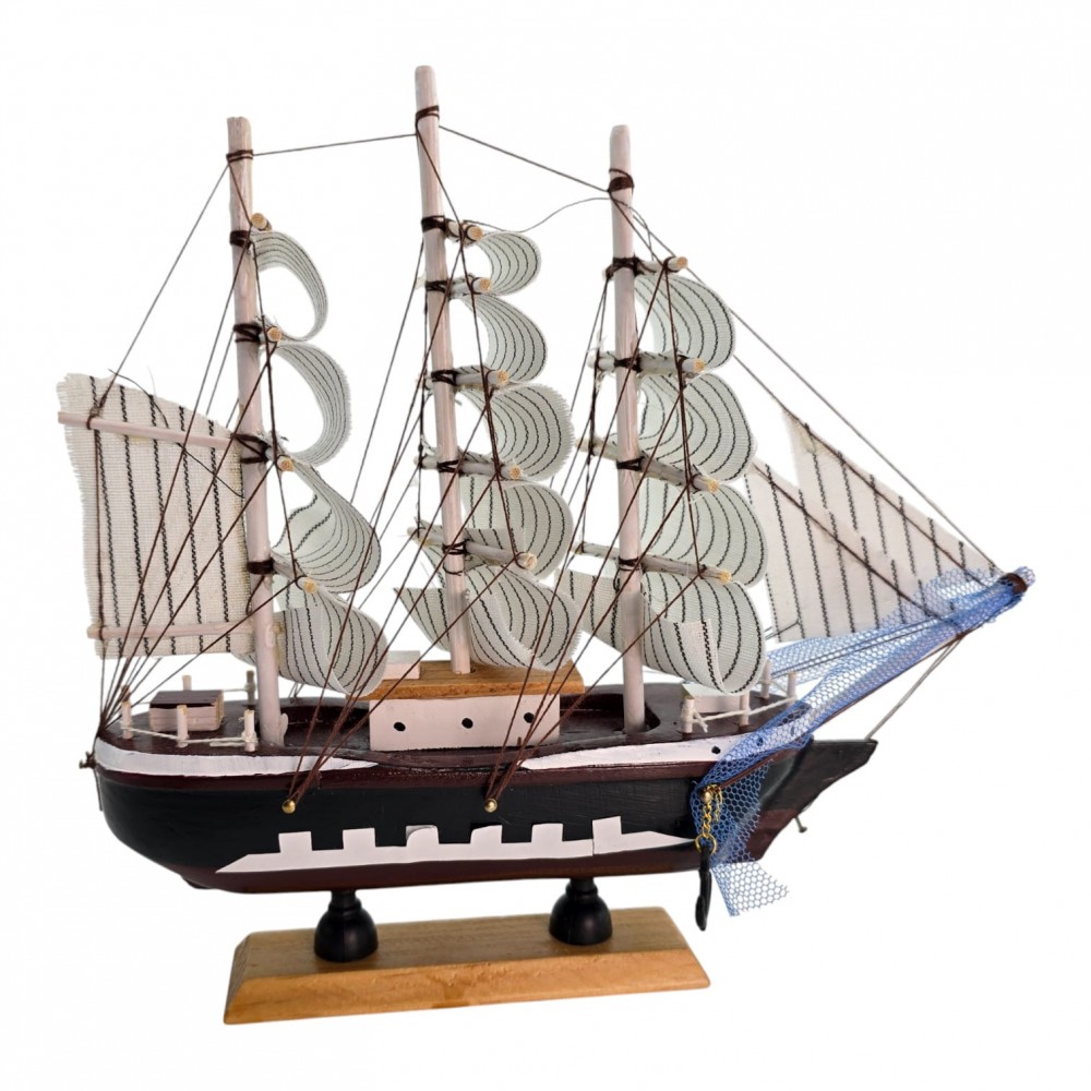 Настольная модель парусного корабля в естественных деревянных тонах с контрастными белыми парусами. Деревянный корпус и мачты, тканевые паруса и шнуровый такелаж создают выразительный морской акцент для полки, камина или рабочего стола. Отличный подарок любителям морской тематики и стильный элемент интерьера.