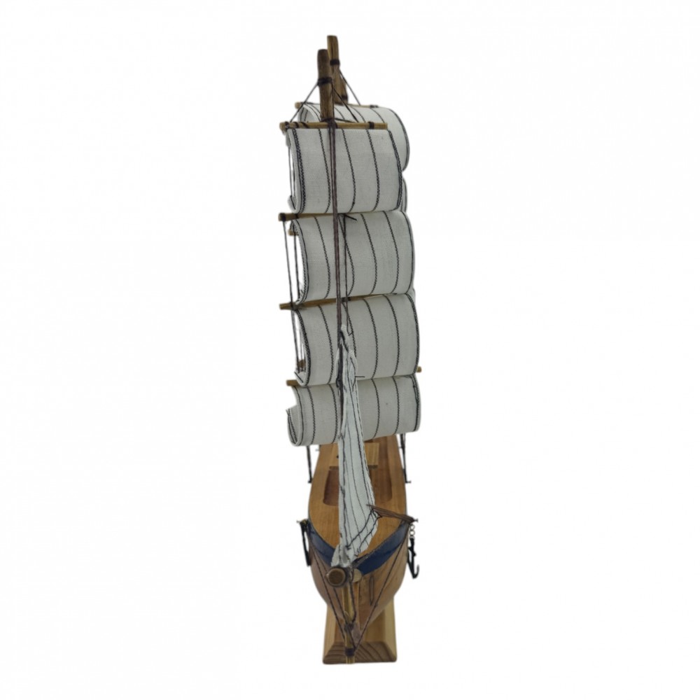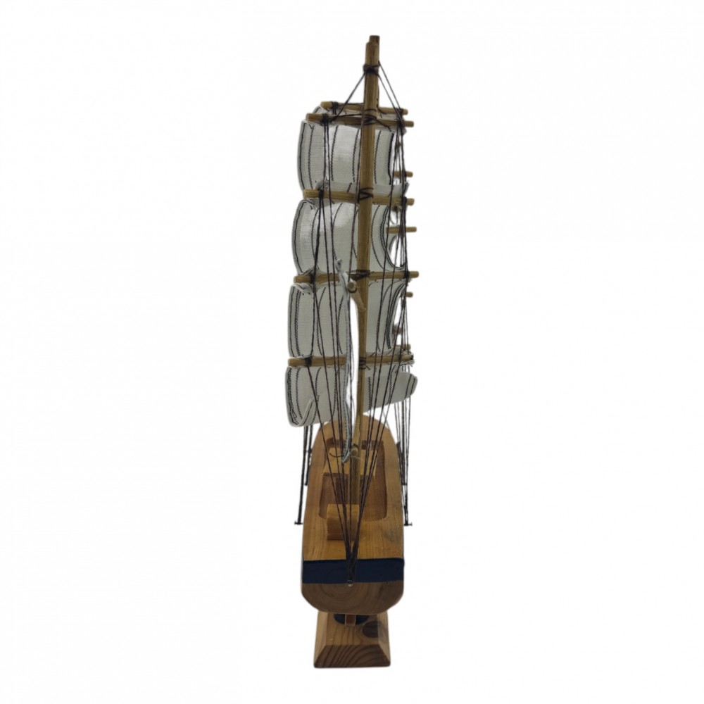 Изящные паруса и продуманные детали мачт создают ощущение лёгкости и движения, словно этот маленький кораблик готов отправиться в далёкое плавание. Модель оснащена деревянной подставкой, которая добавляет устойчивости и делает её удобной для размещения.