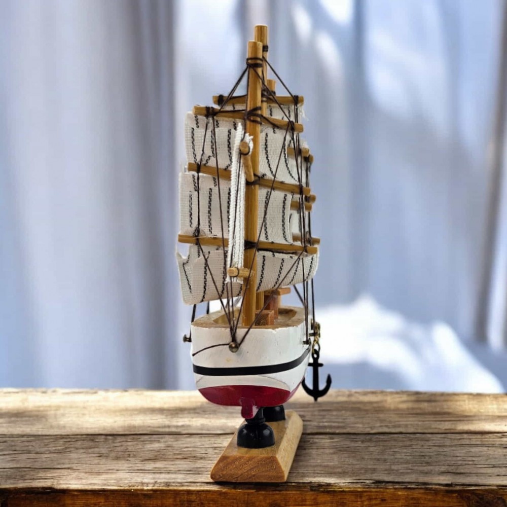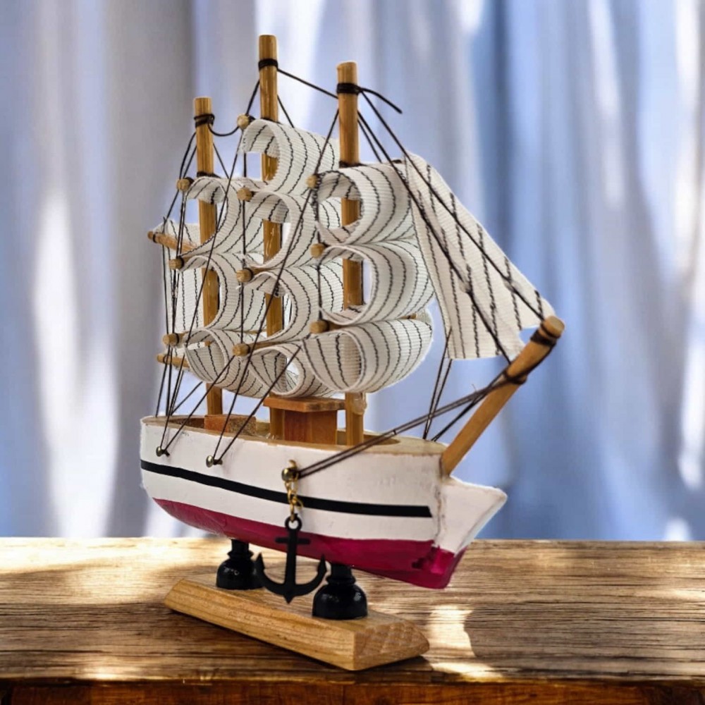 Изящные паруса и продуманные детали мачт создают ощущение лёгкости и движения, словно этот маленький кораблик готов отправиться в далёкое плавание. Модель оснащена деревянной подставкой, которая добавляет устойчивости и делает её удобной для размещения.