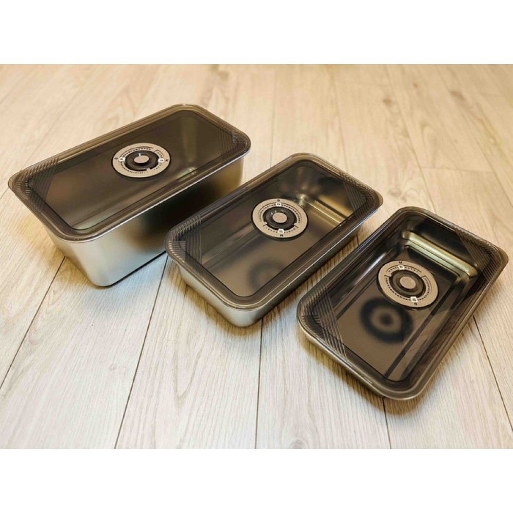 Вакуумні контейнери призначені для тривалого зберігання сухих і свіжих продуктів. Вони надійно захищають продукти від негативної дії повітря. Такий контейнер продовжує термін зберігання продуктів, збереже свіжість, смак, аромат та колір продуктів. Завдяки тому, що у вакуумному середовищі гинуть шкідливі бактерії та мікроорганізми. Продукти у вакуумних контейнерах можна зберігати за таких же температур, що й у звичайній упаковці. М’ясо та молочні продукти – у холодильнику, овочі, свіжі фрукти та зелень – при температурі 8-15°С, а крупу чи хліб – при кімнатній температурі. Фрукти, поміщені в такий контейнер, зберігають свіжість у 3-4 рази довше, ніж упаковані поліетиленові пакети.
