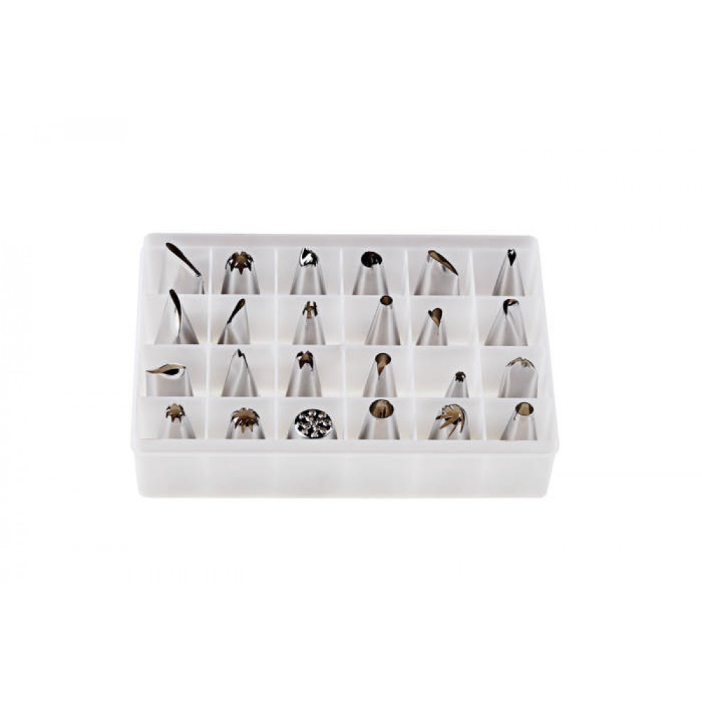 Бренд : EmpireМодель: СолоНабір: 24 штМатеріал : Нержавіюча стальДіаметр верх: від 0,2 до 2 смДіаметр низ: від 1,5 до 2,5 смВисота: від 2,5 до 3,5 смУпаковка: Пластиковий бокс.Країна виробник : К.Н.Р