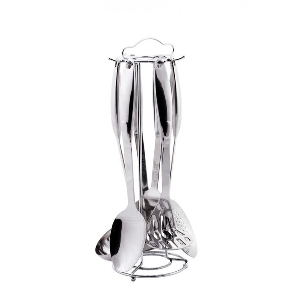 Відмінний та практичний кухонний сталевий гарнітур для кулінарії.Зручне зберігання кухонного приладдя на стійціПолірована поверхня має захисні властивості, гігієнічну, її легко чистити.Прилади з нержавіючої сталі здатні служити довгі роки, вони успішно протистоять дрібним подряпинам, стійкі до корозії та гігієнічні.Такі прилади не тьмяніють, не вступають у хімічні реакції та не змінюють смак продуктів.