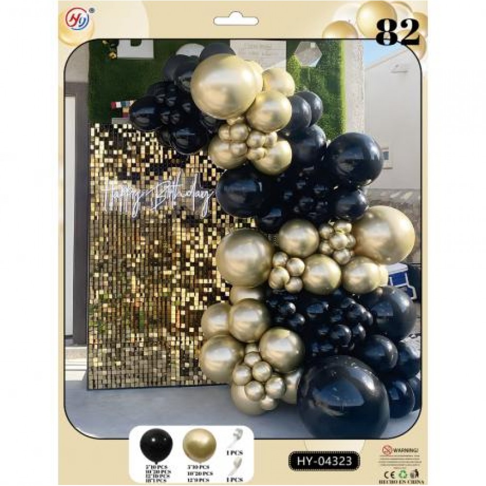 Набір повітряних куль містить 82 кулі різних розмірів і кольорів. У комплект входять чорні кулі: 5" (10 шт), 10" (20 шт), 12" (10 шт), 18" (1 шт) та золоті кулі: 5" (10 шт), 10" (20 шт), 12" (9 шт). Також є стрічка для кріплення куль і один рулон клейових точок.
