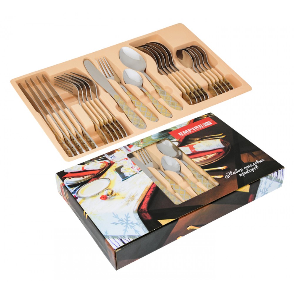 Бренд : EmpireМодель: АльфаНабір: 24 штКількість осіб : 6 штМатеріал : Нержавіюча сталь.Довжина:Вилка столова: 21 смЛожка столова: 21 смНіж столовий: 23 смЛожка чайна: 15 смПосудомийна машина : ТакУпаковка : Фірмова коробкаКраїна виробник : К.Н.Р