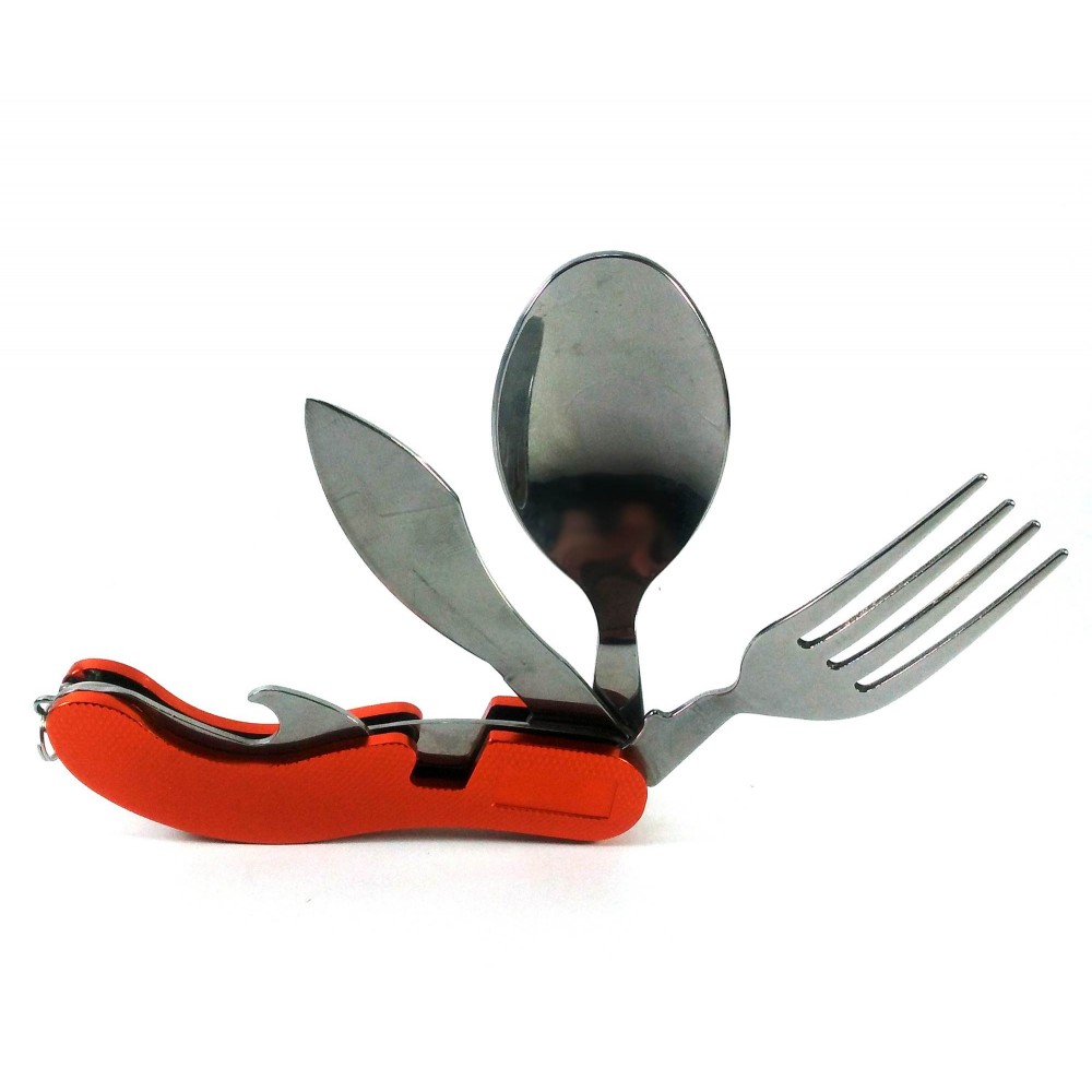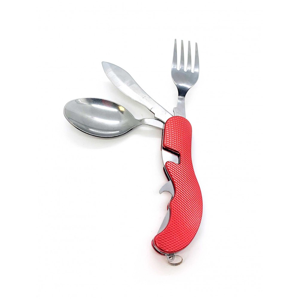 Складной нож имеет размеры 100х40х35 мм, что делает его идеальным для переноски в кармане или сумке. Он предлагает функциональность и практичность, включая нож, вилку, ложку и открывалку для консервных банок. Независимо от того, где вы находитесь, у вас всегда будет под рукой необходимый инструмент для приема пищи.