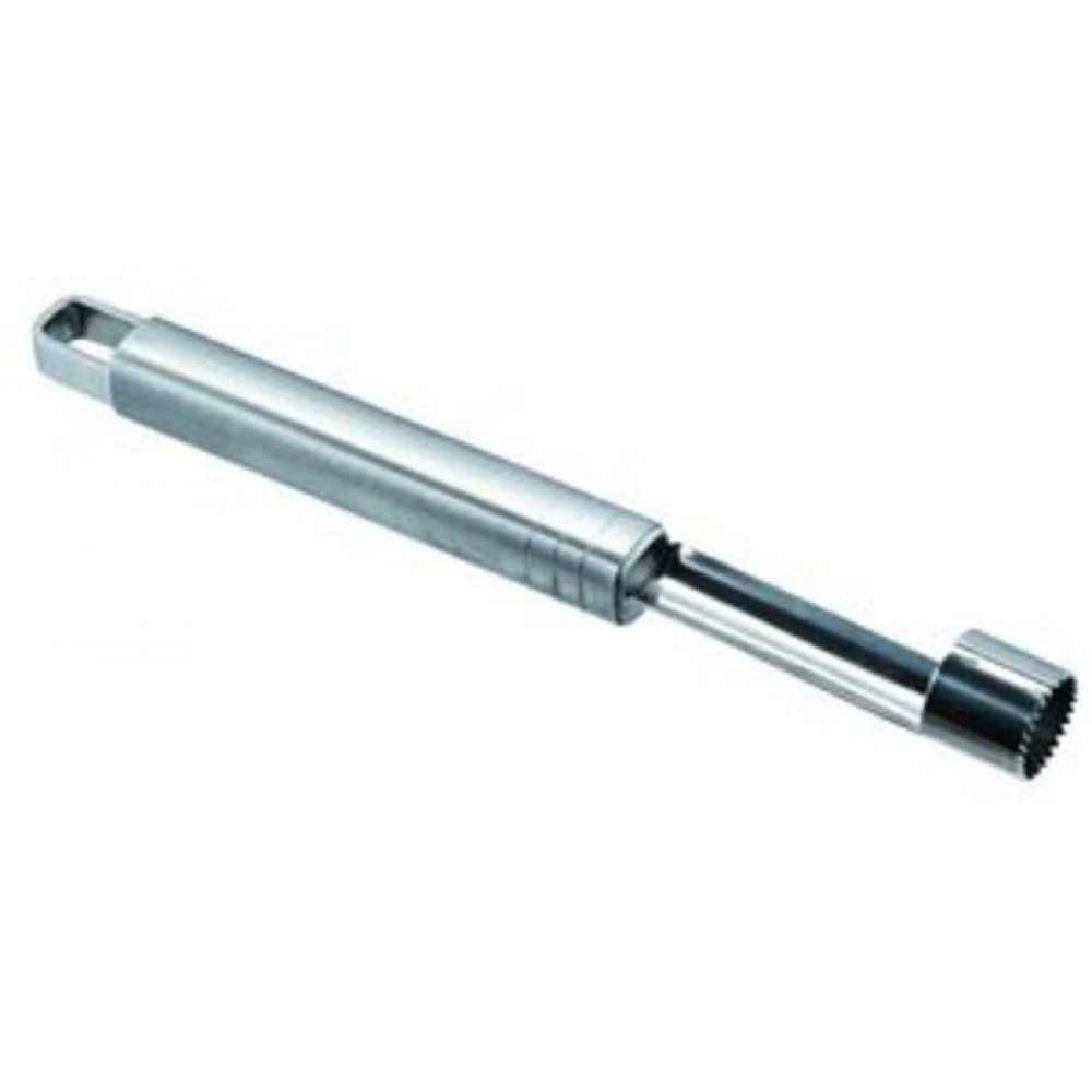 Щоб вирізати внутрішню частину фрукта, необхідно ввести по центру лезо, зробити кілька обертів та натиснути на ручку. Потім слід витягнути ножа з обрізаним шматком. У результаті ми отримуємо яблуко з обережним отвором. Такі яблука можна використовувати для запікання у духовці.