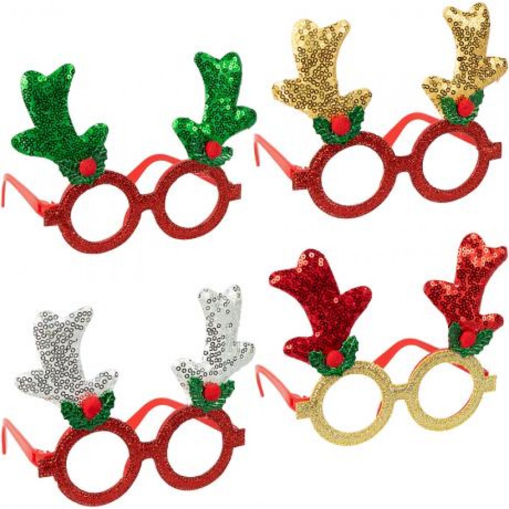 Новорічні окуляри без скелець із декором у вигляді блискучих ріжок та святкових елементів. Прикрашені паєтками й глітером, створюють веселе новорічне настроювання та підходять для фотосесій, вечірок і карнавальних костюмів. Виготовлені з легкого пластику. Розмір: ширина 14 см, висота 13 см, діаметр оправи 6 см, отвір 4,5 см. Зручно сидять і підходять як дітям, так і дорослим.