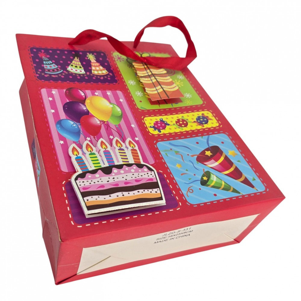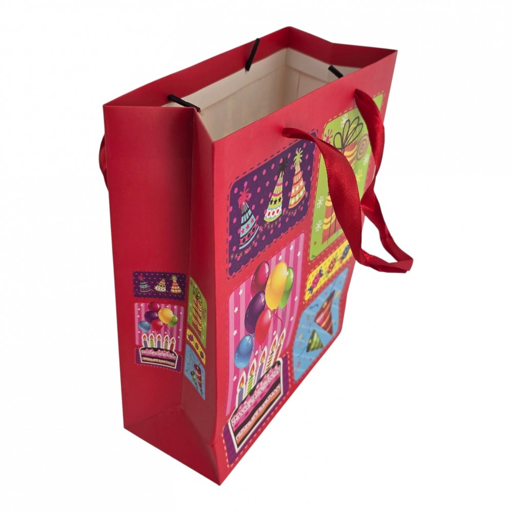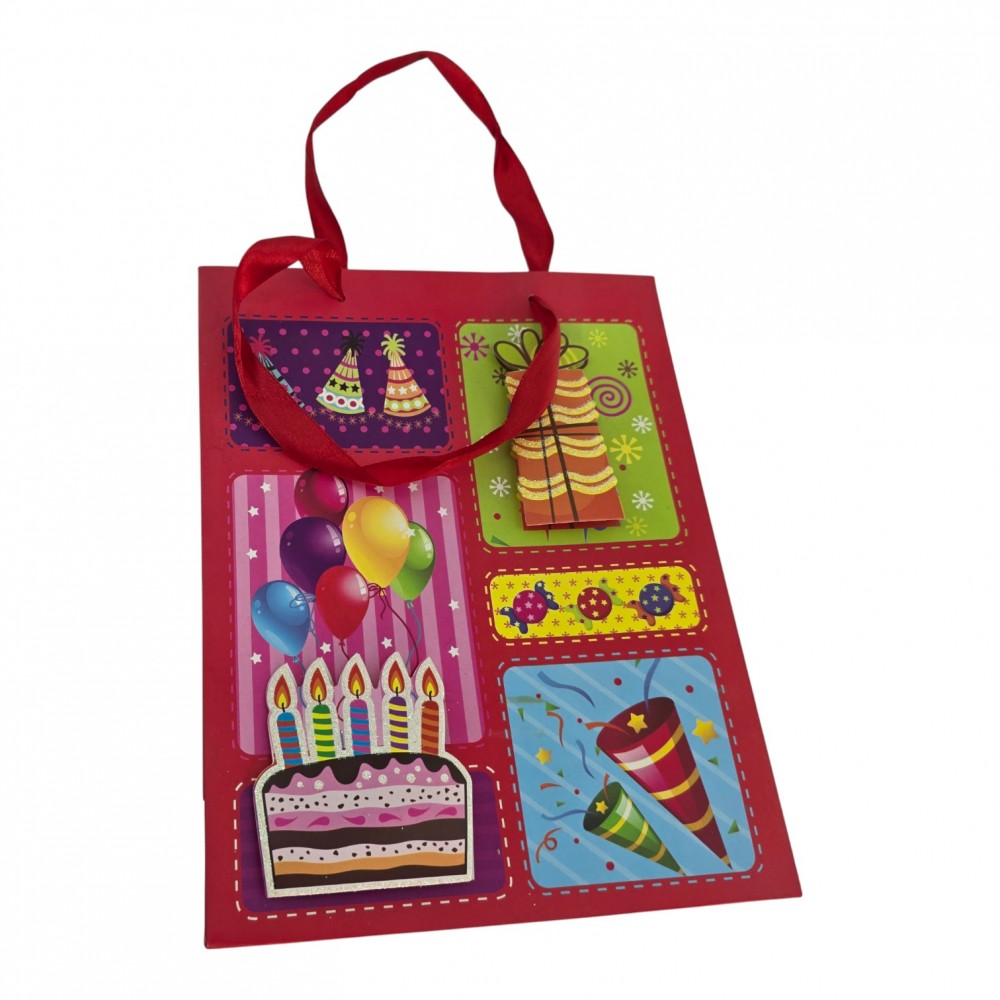 Яркий подарочный пакет с праздничными иллюстрациями: торт со свечами, воздушные шары, колпачки и хлопушки. На лицевой стороне есть объёмные элементы для выразительного вида. Мягкие атласные ручки удобны для переноски, предусмотрен небольшой ярлычок для подписи. Формат подходит для большинства средних сувениров и коробок.