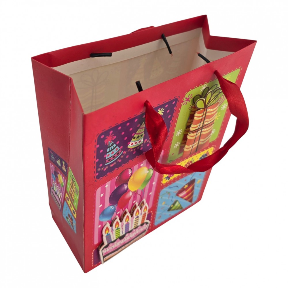Пакет подарочный картонный с аппликацией Happy Birthday красный (18х23х8 см)