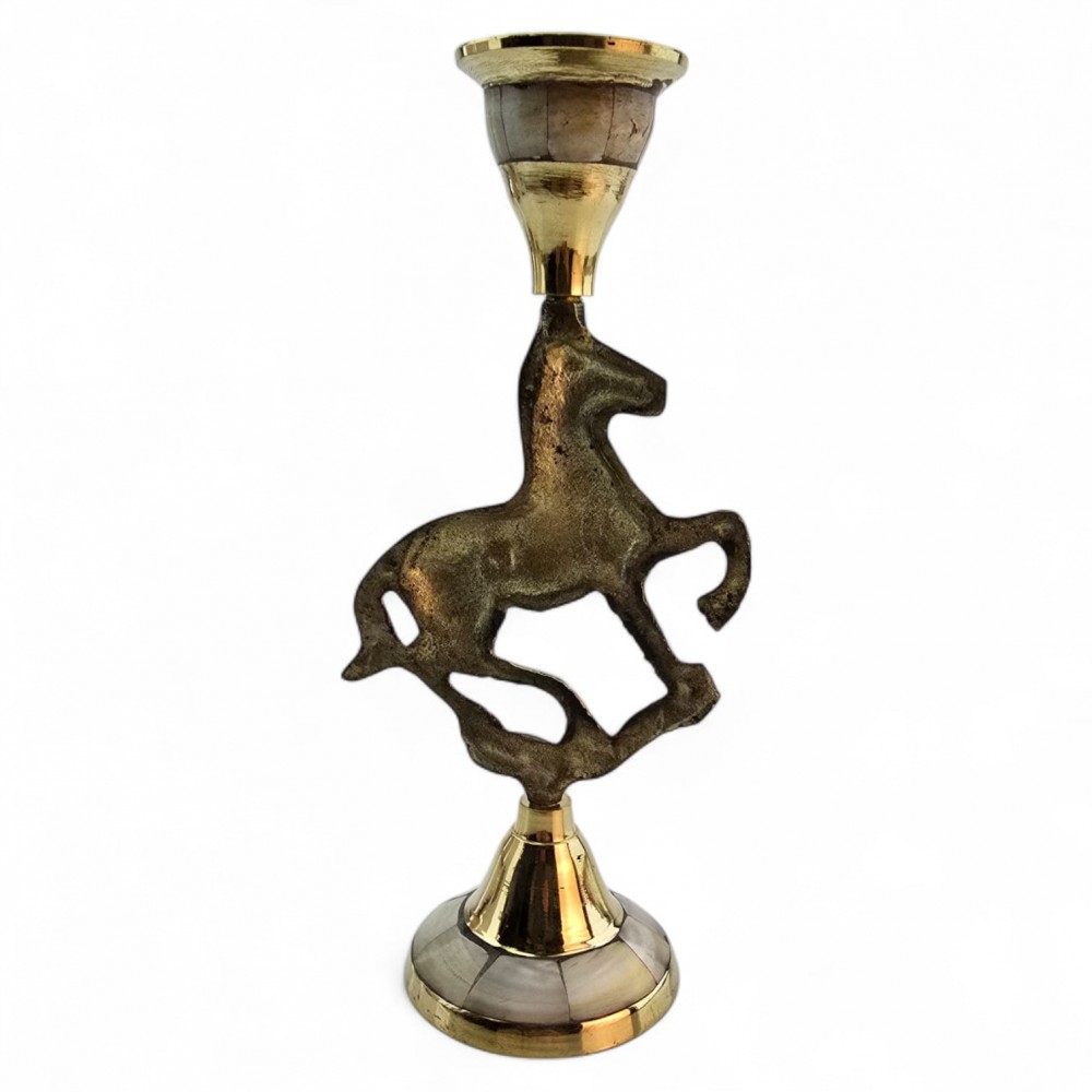 Элегантный латунный подсвечник с фигуркой скачущей лошади олицетворяет энергию, свободу и движение. Перламутровые вставки подчёркивают утончённый стиль изделия. Подходит для тонкой свечи диаметром 2 см.
