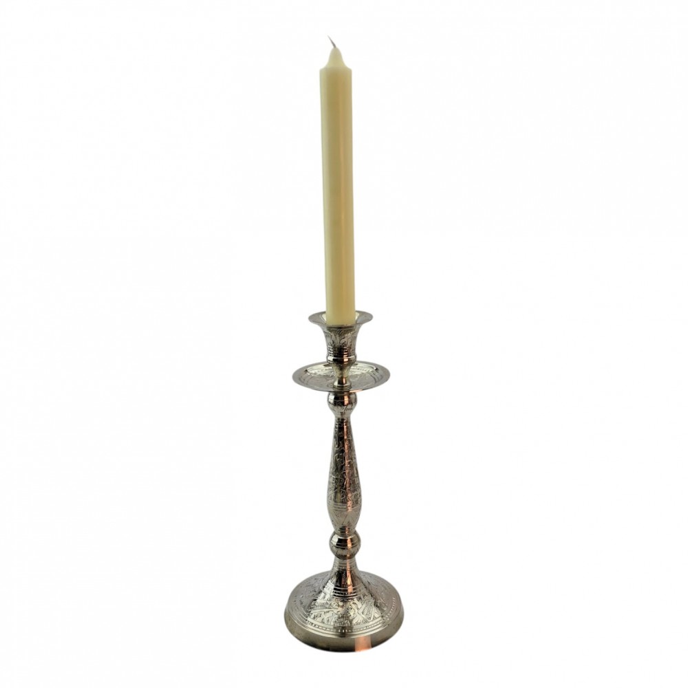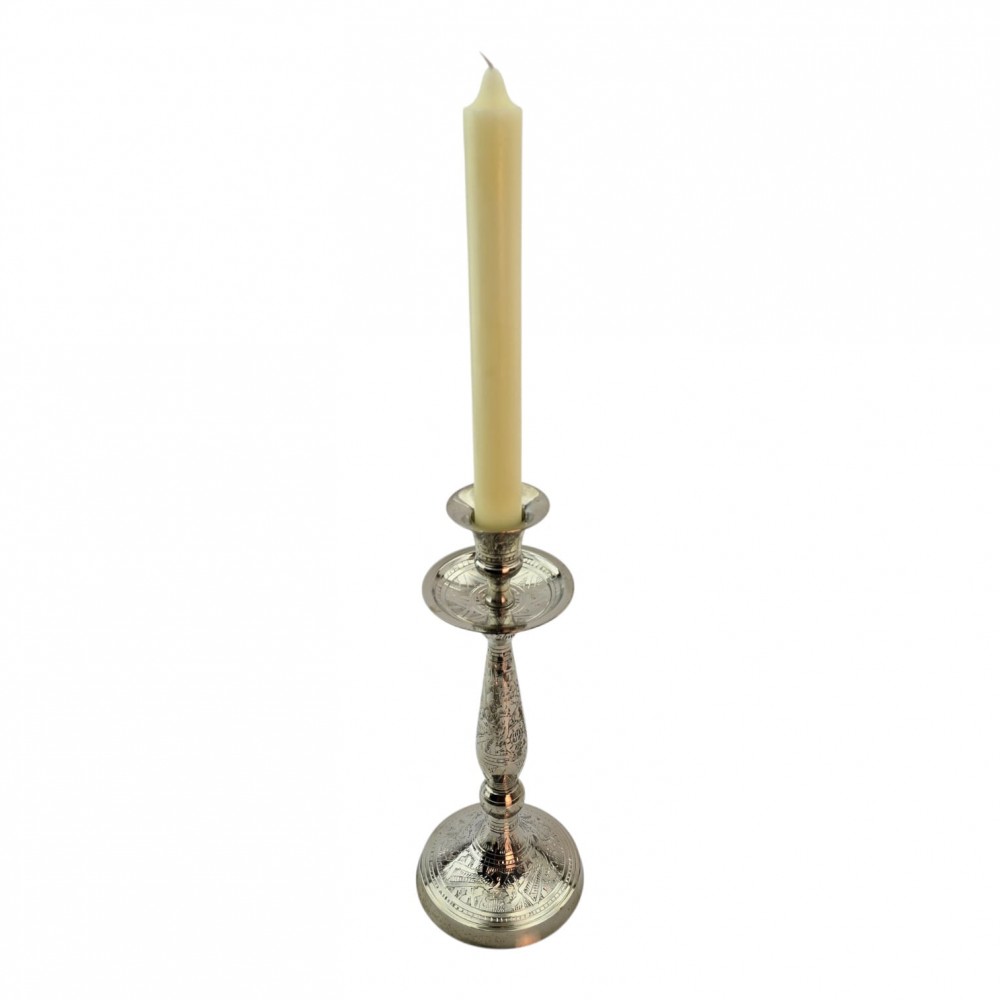 Классический металлический подсвечник из бронзы с покрытием под серебро. Есть блюдце для сбора воска. Подходит для тонких свечей диаметром до 2 см. Свеча в комплект не входит. Возможны небольшие отличия от фото и мелкие погрешности, характерные для индийского производства.
