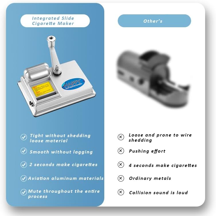 Благодаря интегрированному слайдерному механизму набивка происходит плотно, без просыпания табака и застреваний. Одна сигарета формируется всего за 1–2 секунды, а процесс проходит тихо и плавно, без резких ударов и лишнего усилия.