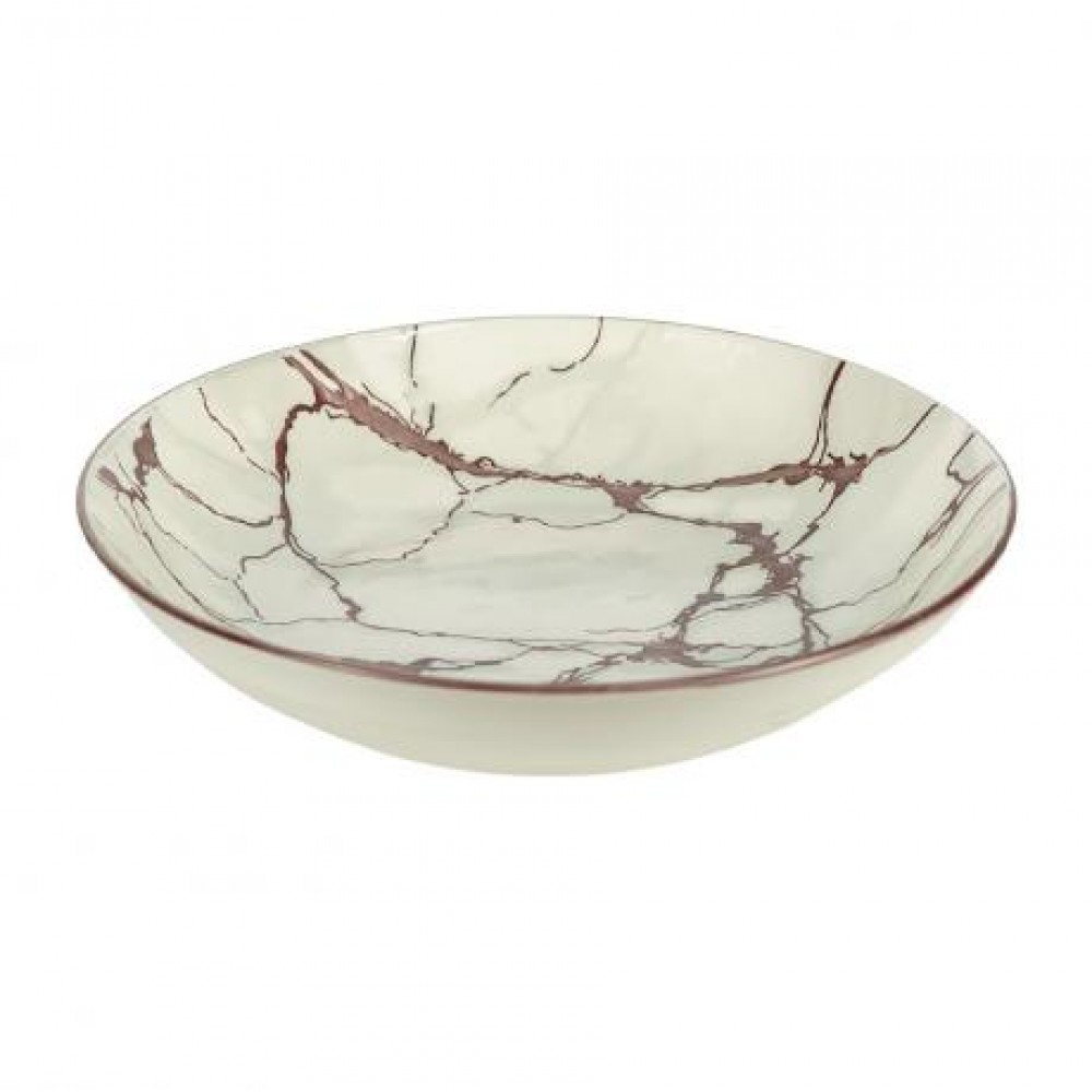 Керамічна тарілка діаметром 18 см і висотою 5 см з виразним мармуровим орнаментом. Дизайн виконаний у кремовому кольорі з контрастними бордовими прожилками, що імітують натуральний камінь. Об’єм 300 мл. Виготовлена з міцної кераміки з гладким глянцевим покриттям. Підходить для подачі супів, салатів, гарнірів, каш та інших страв. Сучасний дизайн доповнить як щоденне, так і святкове сервірування столу.
