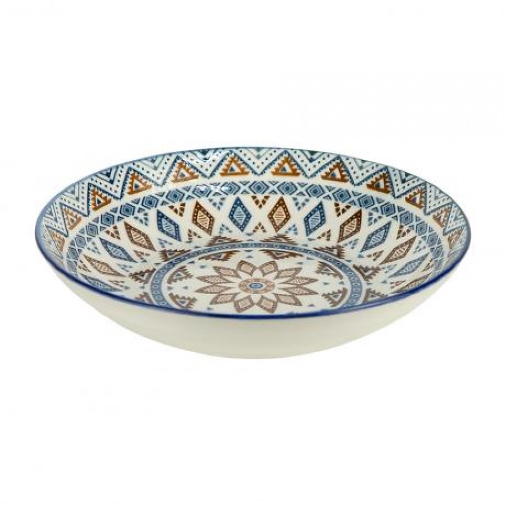 Керамічна тарілка діаметром 18 см і висотою 5 см, об’єм 300 мл. Дизайн виконаний у яскравому етнічному стилі з геометричним орнаментом у синьо-коричневих та теракотових відтінках. Центральний візерунок і декоративна окантовка по краю надають виробу виразного та колоритного вигляду. Тарілка виготовлена з міцної кераміки з глянцевим покриттям, придатна для щоденного використання. Ідеально підходить для подачі супів, салатів, каш, гарнірів та інших страв, а також для ефектного сервірування столу.