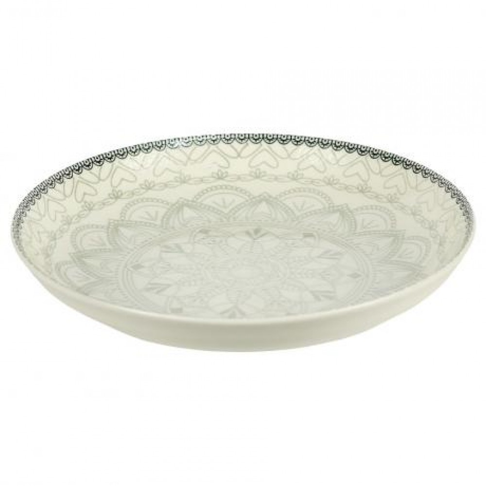 Керамічна тарілка універсального призначення діаметром 20,5 см і висотою 5,5 см, об’єм 500 мл. Виготовлена з міцної кераміки кремового кольору та оздоблена витонченим світло-сірим орнаментом у вигляді мандали, що надає виробу стриманого й елегантного вигляду. Мінімалістичний дизайн гармонійно поєднується з будь-яким сервіруванням. Тарілка підходить для щоденного використання та ідеальна для подачі супів, салатів, пасти, каш і других страв.