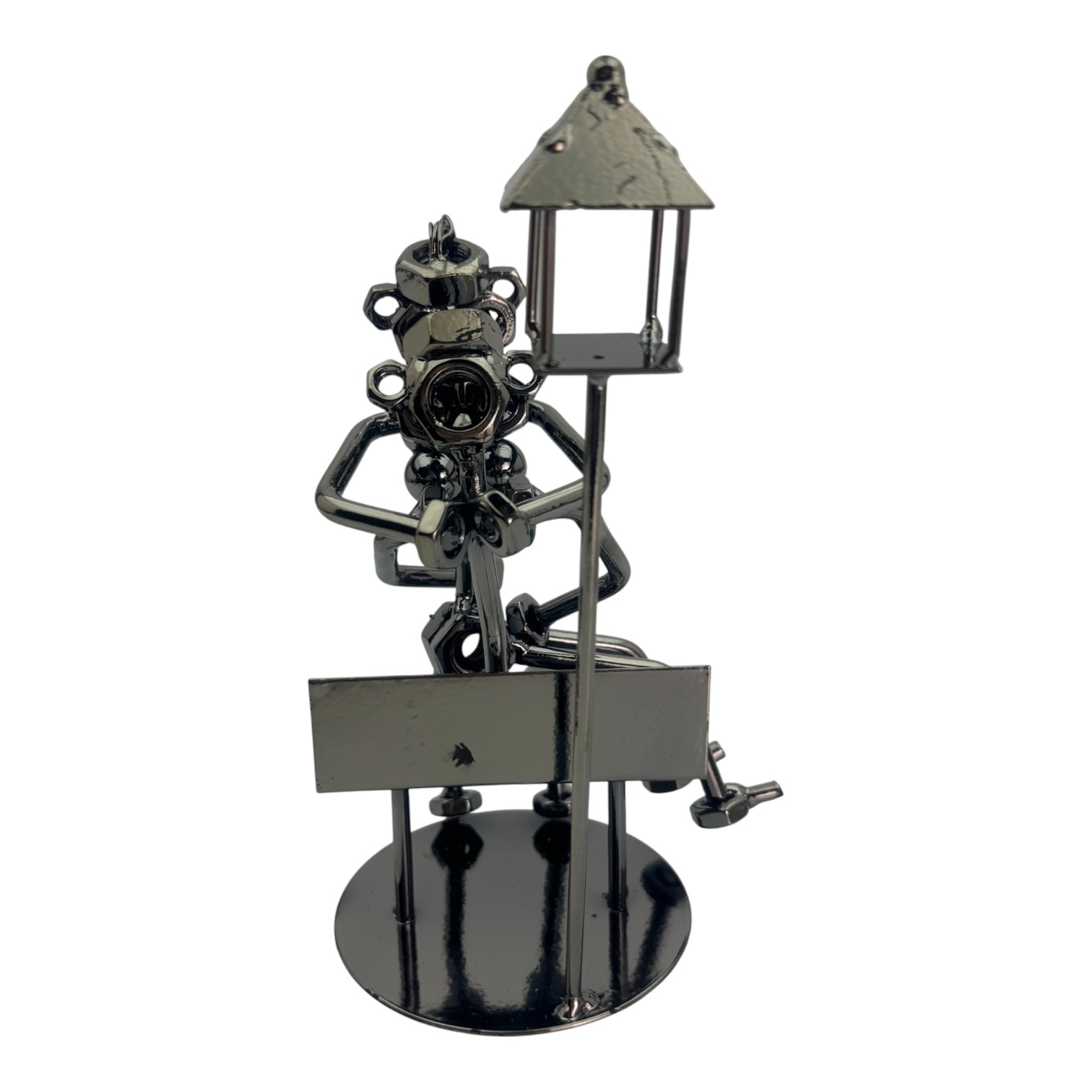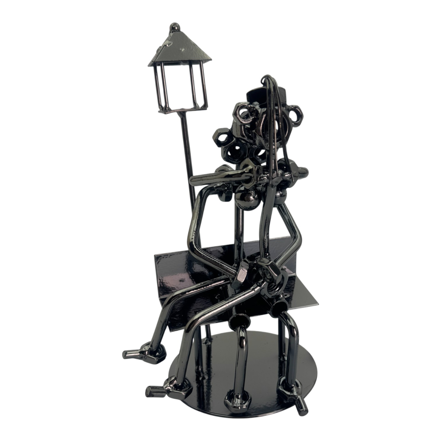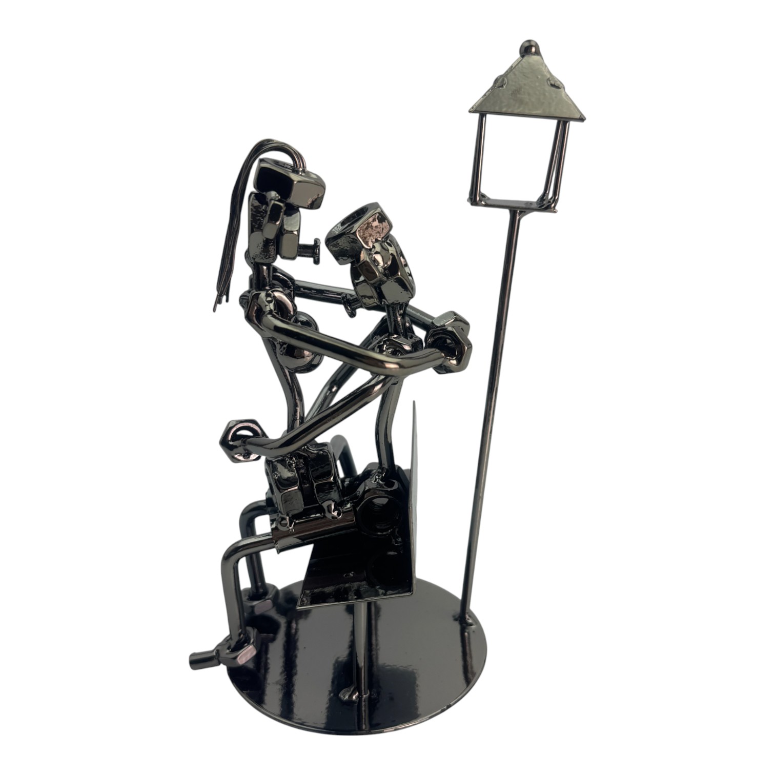 Статуэтка "Техно арт Влюбленные" — оригинальный и необычный арт-объект, который станет ярким акцентом вашего интерьера. Выполненная в стиле техно-арта, эта статуэтка изображает влюбленную пару, сидящую на скамейке под фонарем. Каждый элемент композиции создан из металлических деталей, таких как гайки, болты и пружины, что придает изделию индустриальный и современный вид.