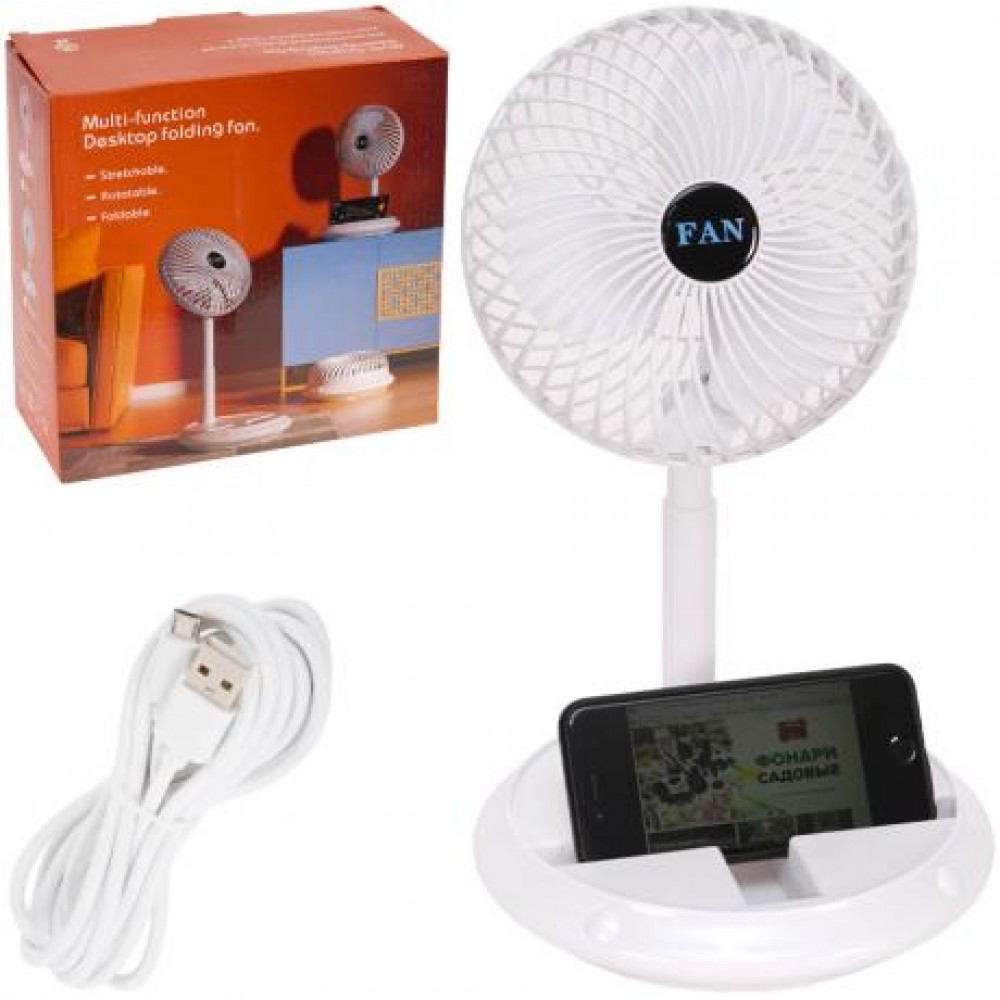 Настільний вентилятор заряджається через кабель USB від розетки (кабель в комплекті). Працює від акумулятора. Має три швидкості обдування. Колір білий, рожевий. Розмір у розкладеному вигляді 31х21см