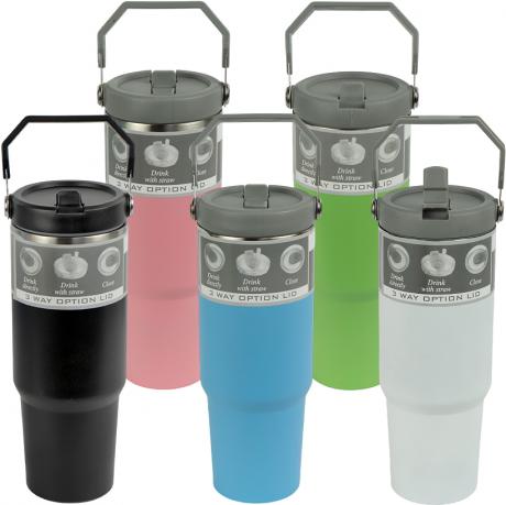 Передбачено два варіанти пиття — через трубочку у відкритому вигляді та через носик. Кришка оснащена ручкою для носіння. Матеріал BPA free, дозволено миття в посудомийній машині. Розмір стакана 23×7 см, коробки 24,5×10×10,5 см, довжина трубочки 18 см. Оптимальний варіант для оптових закупівель і продажу.
