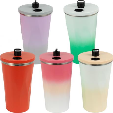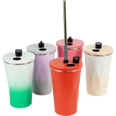 Модель має шорстку з гранованим рельєфом поверхню, що забезпечує зручний хват і сучасний вигляд. У комплекті передбачена трубочка довжиною 15 см із силіконовою насадкою 7 см для комфортного пиття. Пластикова кришка відкручується та щільно прилягає, є отвір для трубочки й місце для зберігання маленької кришечки.