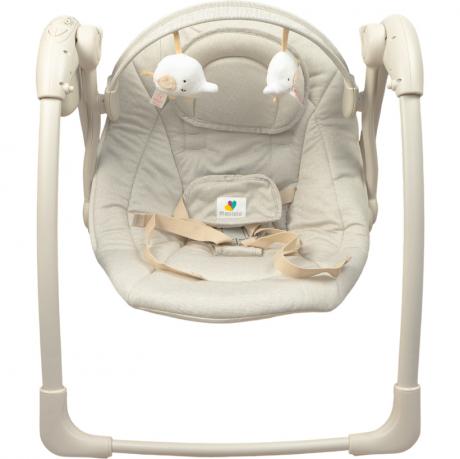 Шезлонг оснащений плавним заколисуванням, музичним блоком і підвісними іграшками, які допомагають заспокоїти дитину та сприяють розвитку слуху й зору. Завдяки складаній конструкції його легко зберігати та переносити.