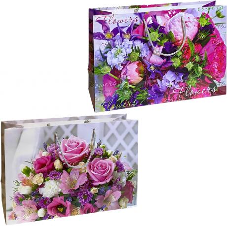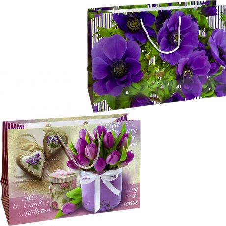 Великий кольоровий пакет "Квіти" горизонтального формату. Глянцева поверхня, ручки-шнурки. Розмір 36х25х10 см. У наборі 12 штук, кольори в асортименті.