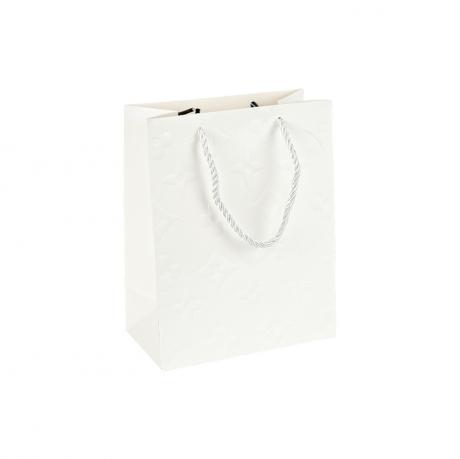 Подарунковий пакет із тисненням виконаний з картону та призначений для пакування подарунків, сувенірів та аксесуарів. Рельєфний візерунок надає виробу акуратного та презентабельного вигляду. Оснащений мотузковою ручкою.