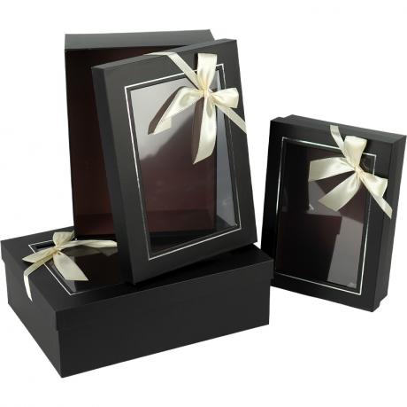 Набір подарункових коробок чорних 3 шт. Розміри — 29×21×9,5 см, 25,5×18,5×8 см і 22,5×16,5×6 см. Коробки жорсткої конструкції, вкладаються одна в одну та додатково упаковані в плівку, що зручно для зберігання і транспортування. Оформлені святковою стрічкою з бантом. Кришка оснащена прозорим віконцем із щільної плівки, виконаним у форматі фоторамки, що дозволяє бачити вміст і надає упаковці охайного вигляду. Підходять для подарунків і святкових наборів. Товар вигідний для оптових магазинів і підходить для роздрібного продажу.