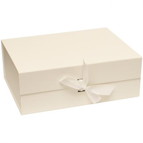 Подарункова складна коробка зі стрічкою призначена для оформлення подарунків та презентаційної упаковки. Розмір у зібраному вигляді — 28,2×20,2×9,2 см. Розмір в упаковочному пакеті — 38х28,3 см. Коробка білого матового кольору. Кришка фіксується за допомогою магнітів і додатково оформлена стрічкою, яка акуратно протягується через спеціальні отвори та з’єднує кришку з коробкою, забезпечуючи надійне закриття й охайний вигляд. Конструкція складна, кути фіксуються за допомогою вже нанесеної двосторонньої клейкої стрічки, що гарантує міцність форми та зручність складання. Товар вигідний для оптових магазинів і підходить для роздрібного продажу.