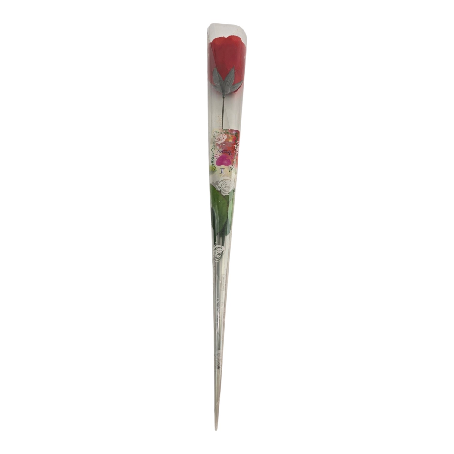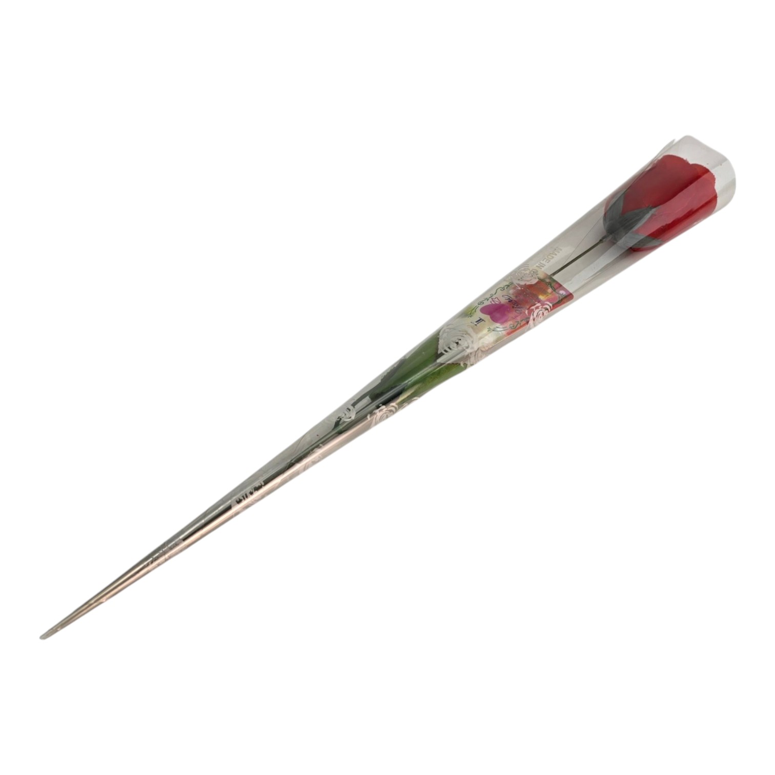 Роза имеет зелёные листочки и длинный стебель. Поставляется в прозрачной подарочной упаковке-конусе — можно дарить сразу, без дополнительной обёртки.