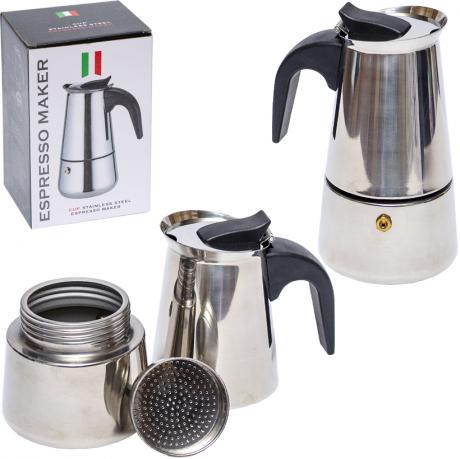 Гейзерна кавоварка MR-6 розрахована на 6 чашок еспресо. Виготовлена з нержавіючої сталі, вона забезпечує простоту приготування кави та легкий догляд. Розміри кавоварки: 21 см в висоту, 10 см в діаметрі, 12,5 см в ширину.