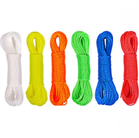 Цей мотузок виготовлено з поліпропілену, має кольорове забарвлення. В одній упаковці знаходиться 12 мотків, кожен довжиною 15 метрів і шириною 3 мм.
