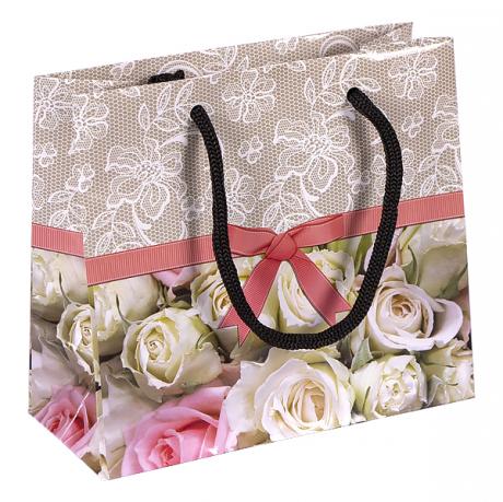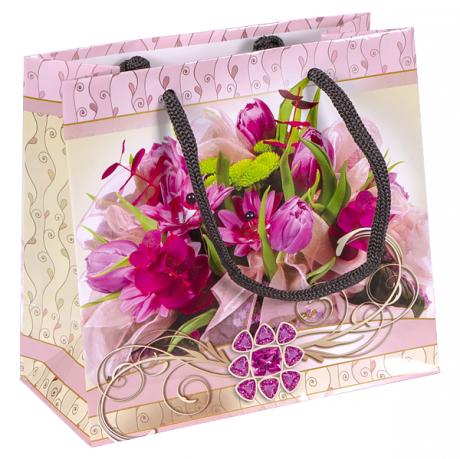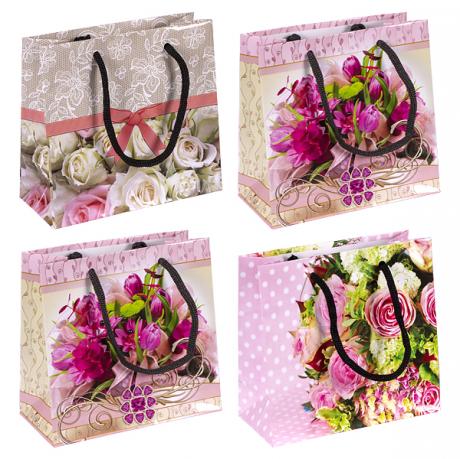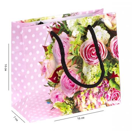 Подарунковий пакет кольоровий з глянцевою поверхнею. Має ручки-шнурки. Розмір пакета 16х16х7 см. У комплекті 12 штук.