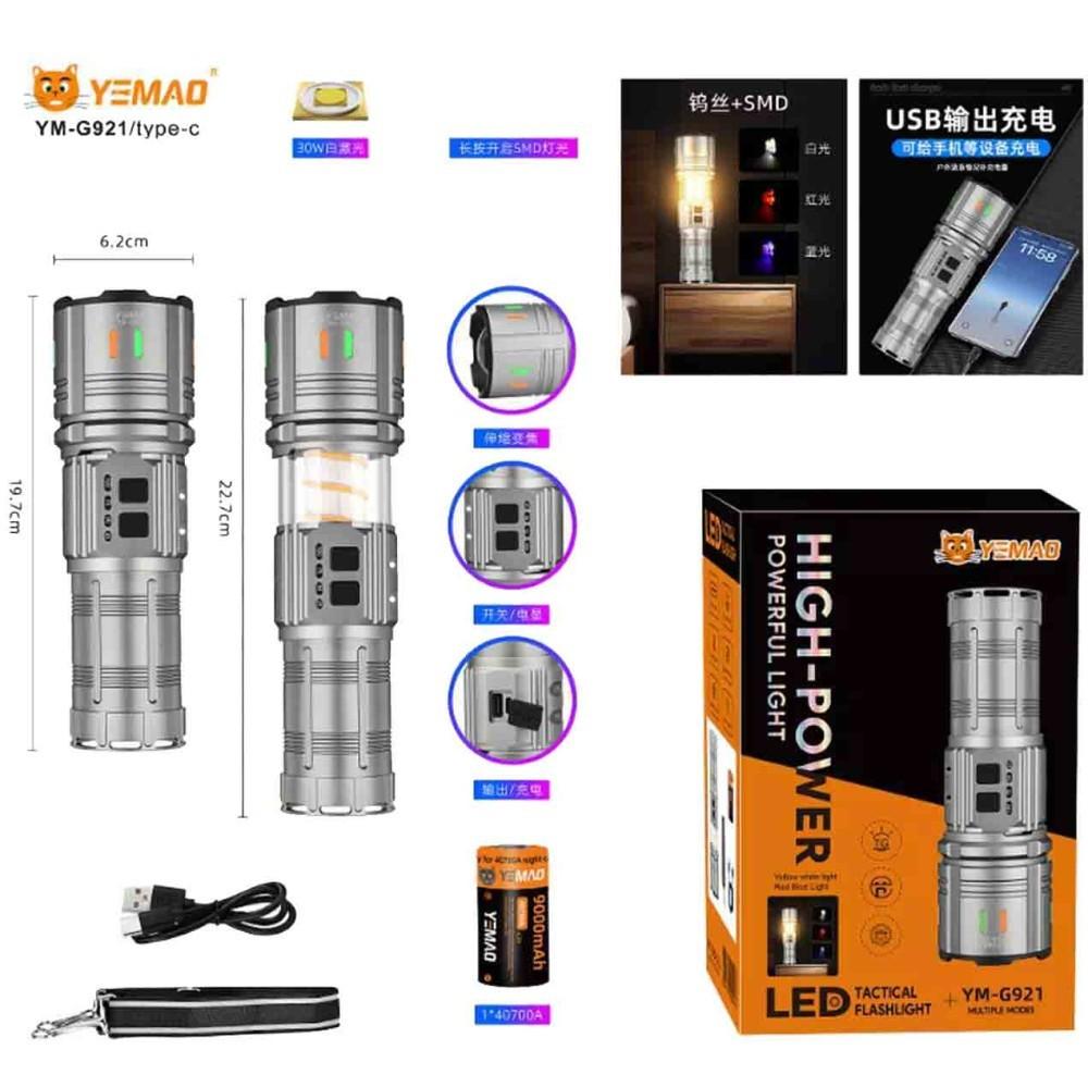 Фонарь YEMAO YM-G921 TG 30W, 1x40700, Power Bank, ЗУ Type-C, zoom, функция лампы