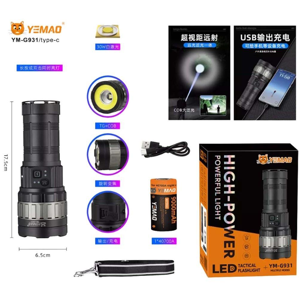 | Комплектация, | фонарь, 1x40700 аккумулятор, USB кабель для зарядки, ремешок |