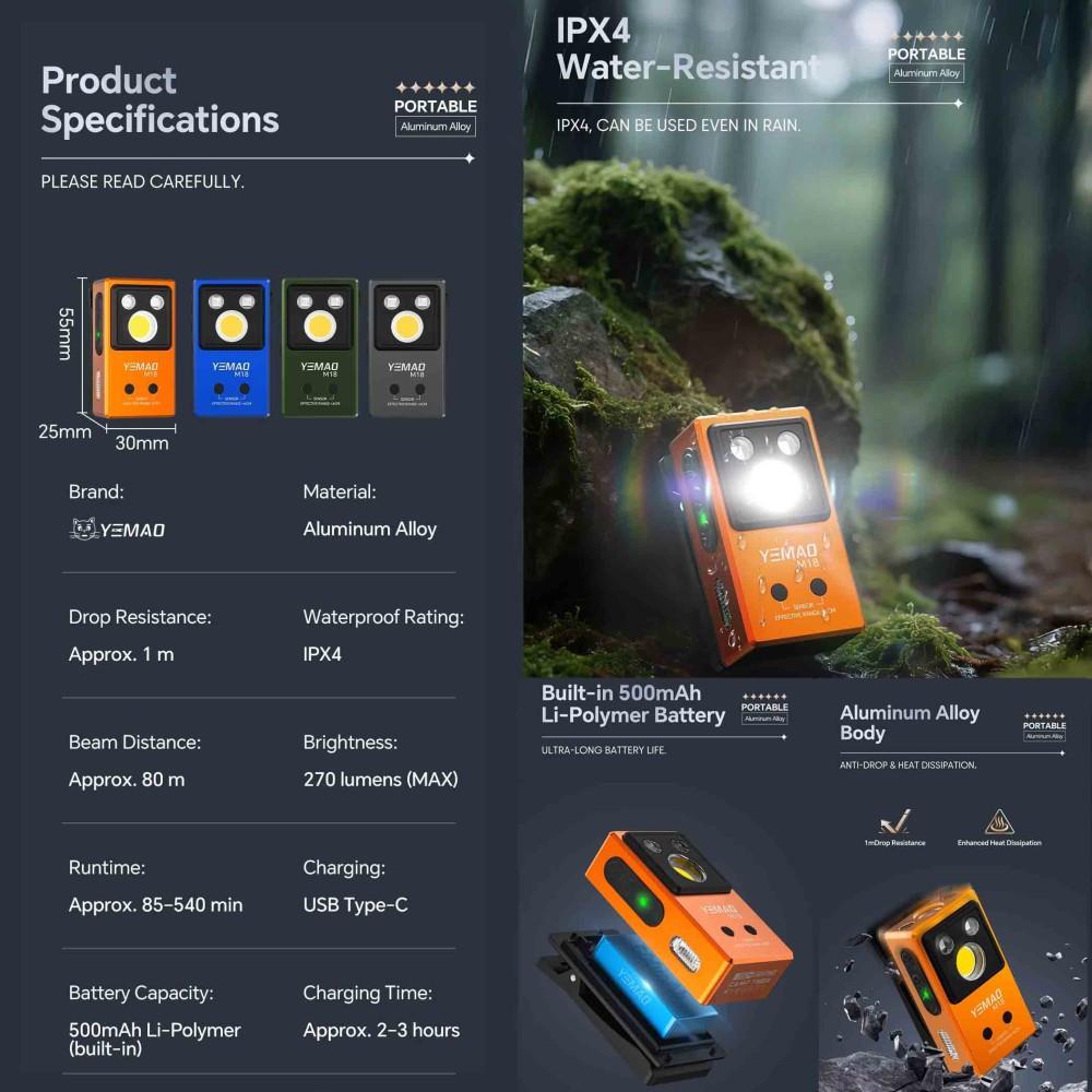 Дополнительные характеристики: магнит, RGB подсветка, компактный размер, клипса, влагозащищенный корпус