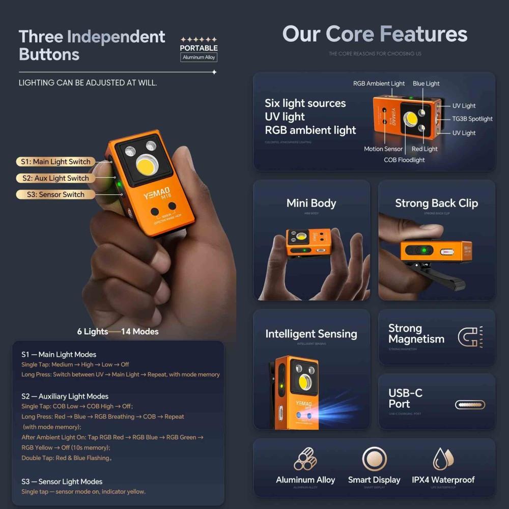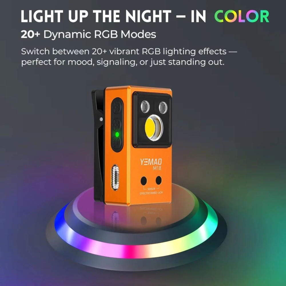 Фонарь YEMAO YM-M18 TG+2UV+SMD(RGB), Motion Sensor , Li-Ion аккумулятор, ЗУ Type-C, магнит, клипса