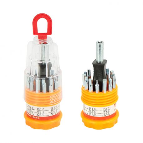 Викрутка багатофункціональна з набором біт призначена для роботи з різними видами кріплення під час побутових і монтажних завдань. У комплект входить 16 змінних біт з різними типами шліца, що дозволяє використовувати набір для ремонту техніки, електроніки та складання виробів. Робочі елементи виготовлені з металу, забезпечують надійну фіксацію. Викрутка оснащена прогумованою ручкою, зручно лежить у руці та не ковзає. Пластиковий контейнер з кільцем для підвісу спрощує зберігання, розмір — 10×3,5 см. Ціна вказана за набір. Товар вигідний для оптових магазинів і підходить для роздрібного продажу.