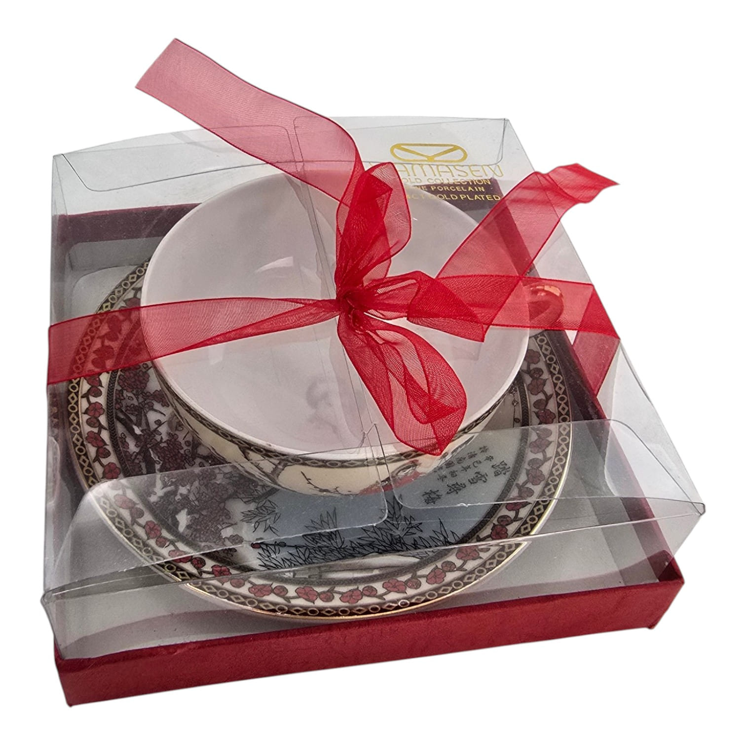 Чашка и блюдце украшены традиционным китайским рисунком: две девушки в ярких одеждах на фоне цветущей сливы (мейхуа). Декор выполнен в классическом стиле с использованием красного, чёрного и золотого цветов. По краю чашки и блюдца — золотой геометрический орнамент.
