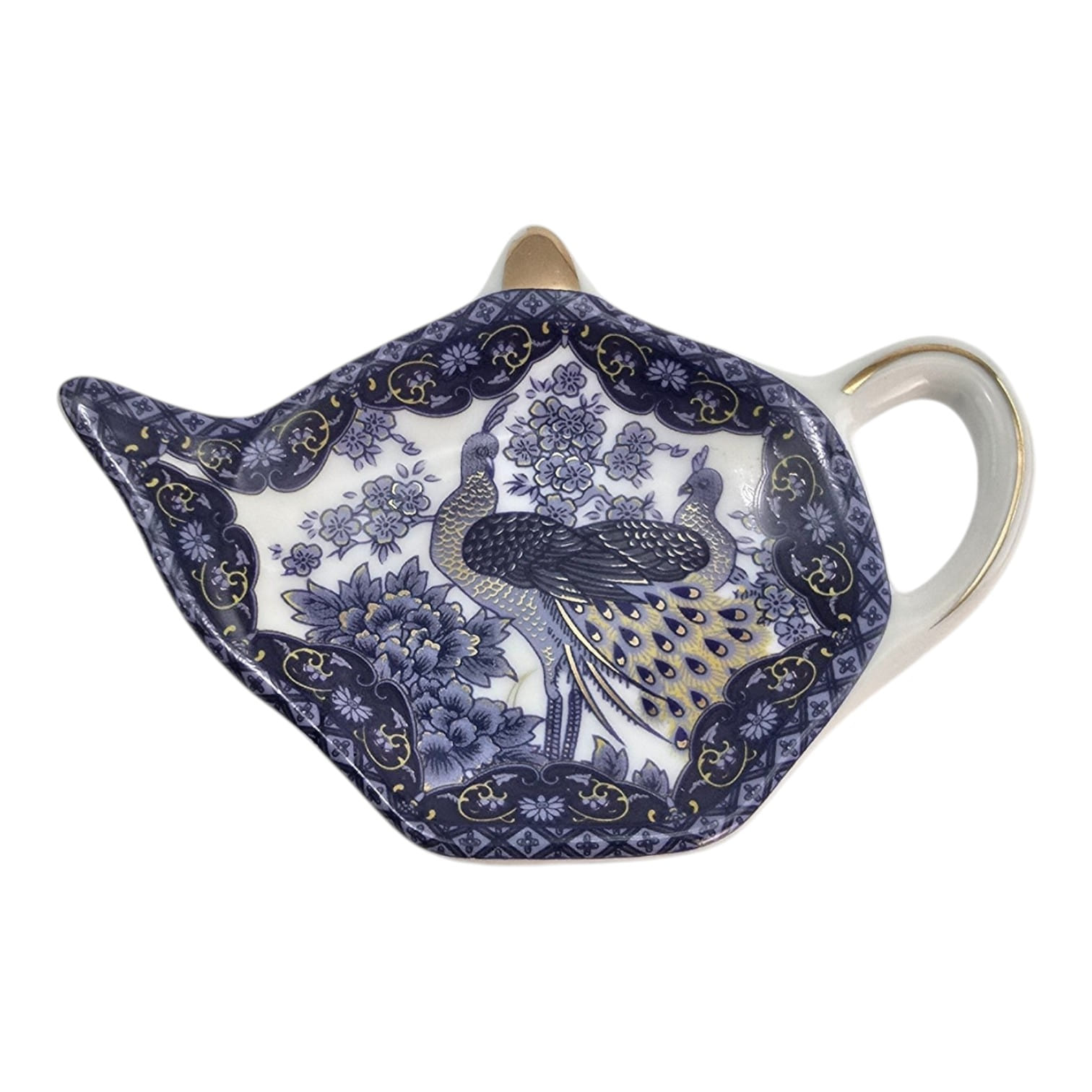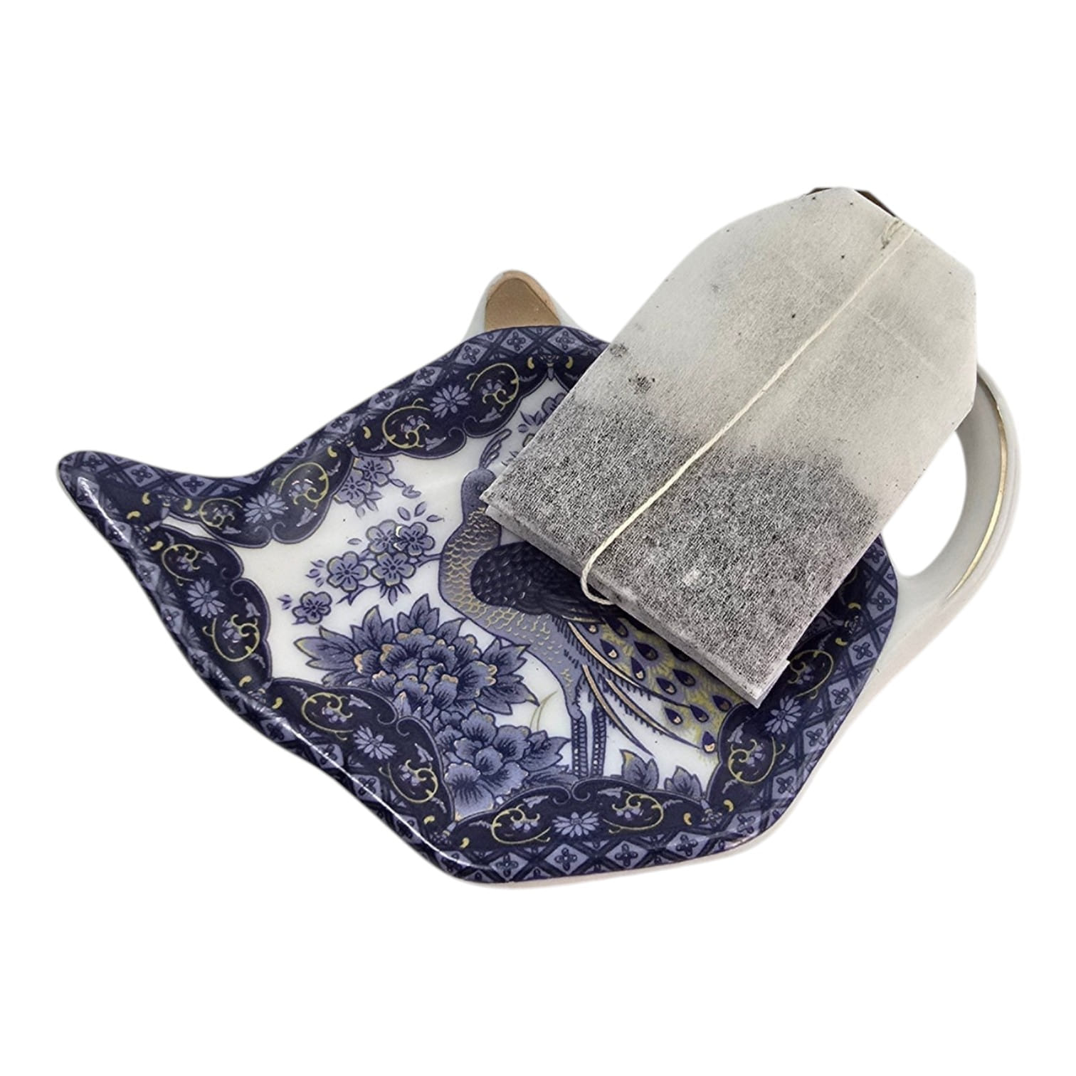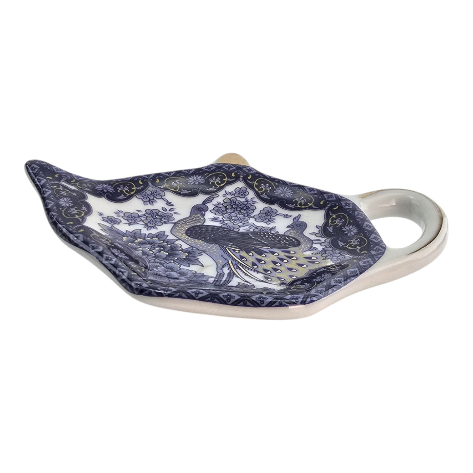 Изделие выполнено в глубоком тёмно-синем цвете с золотыми акцентами. Центральный декор — павлин среди цветов в традиционном китайском стиле. Удобная форма с ручкой позволяет аккуратно размещать использованный чайный пакетик.