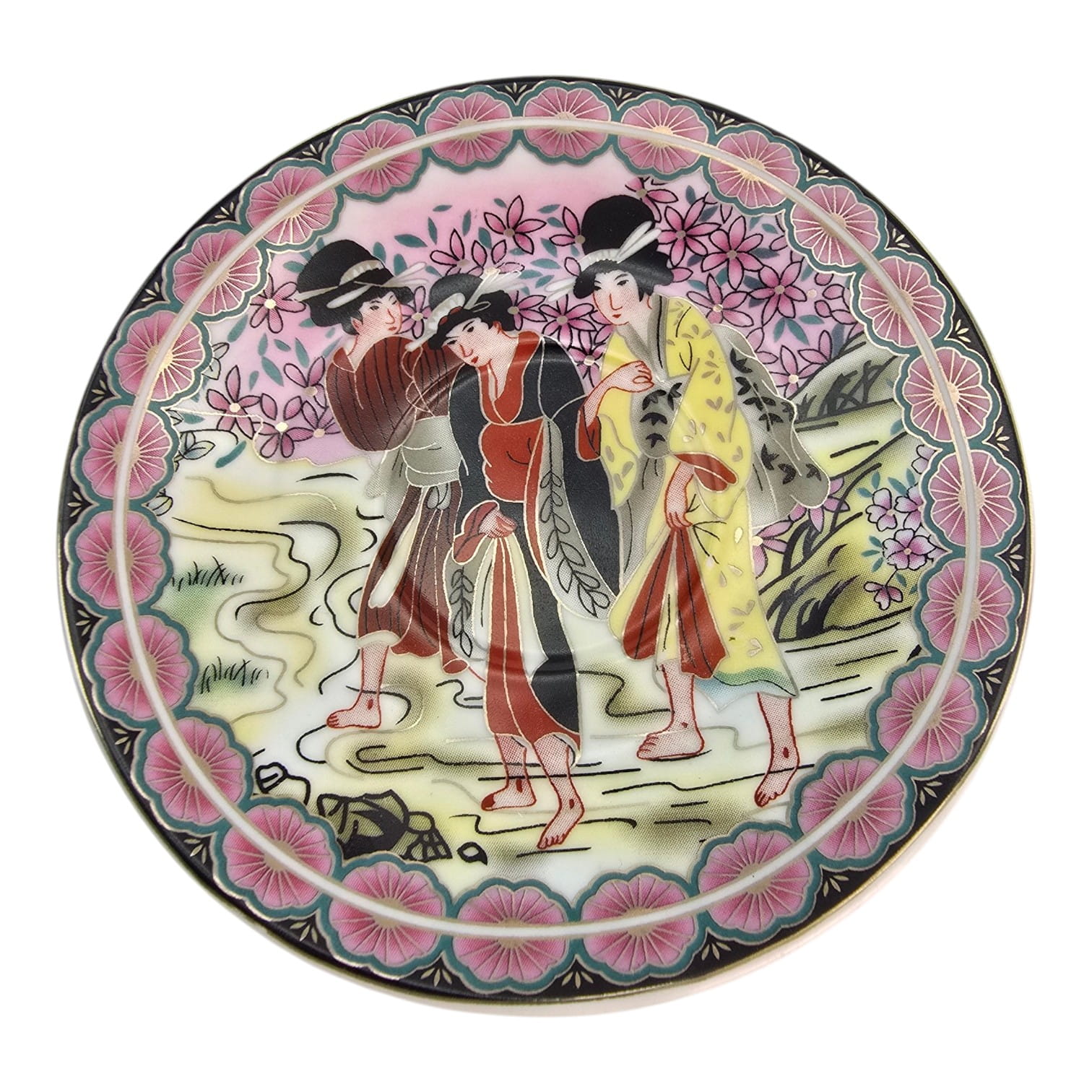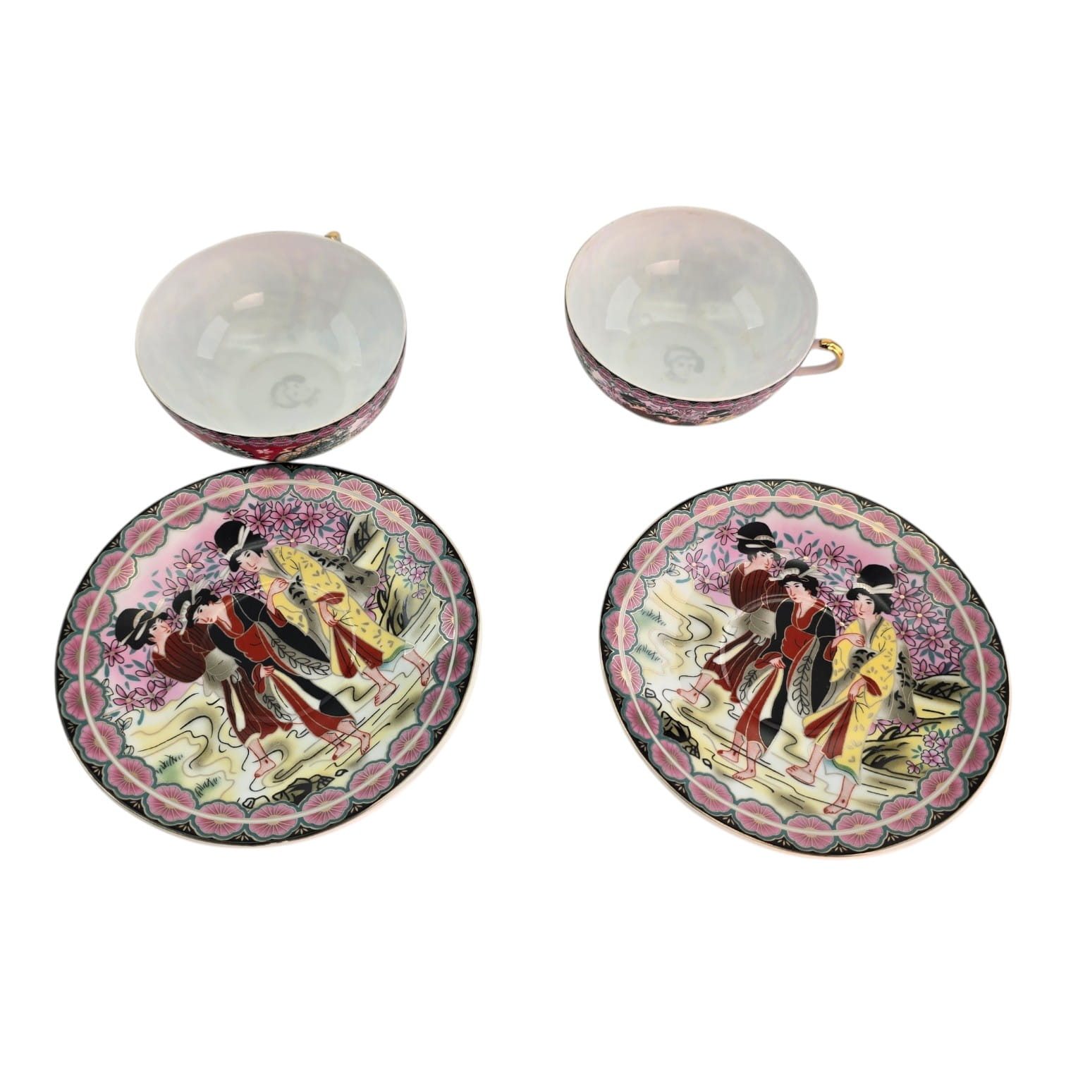 Чашки и блюдца украшены ярким японским декором: традиционные девушки в кимоно на фоне пейзажа с цветами сакуры. Глубокий бордовый фон с богатым золотым орнаментом по краю.